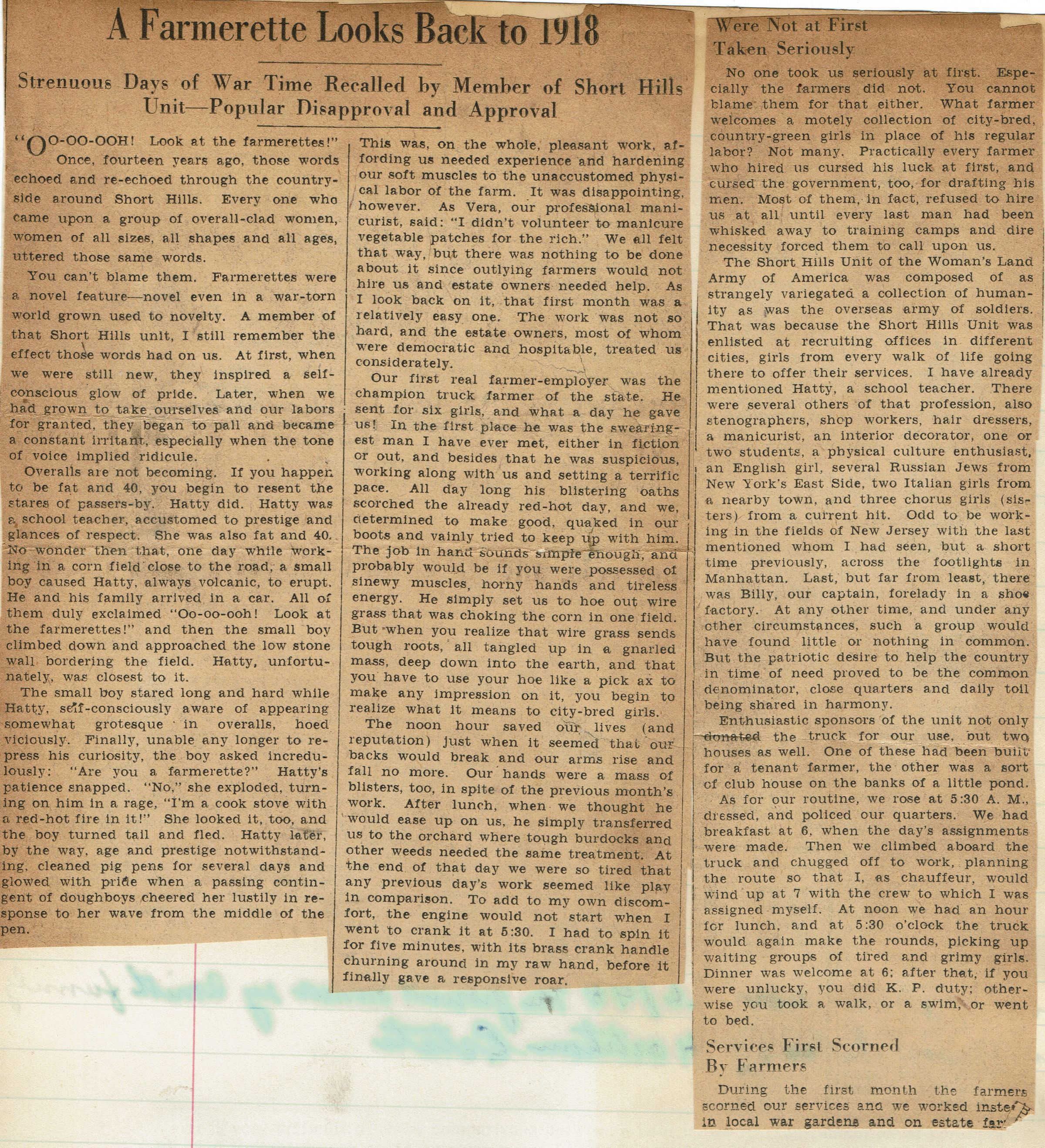 Newspaper Clipping from Herman Wehrle scrapbook, "A Farmerette Looks Back to 1918," discussing the Short Hills Unit of the Woman's Land Army of America from 1918.