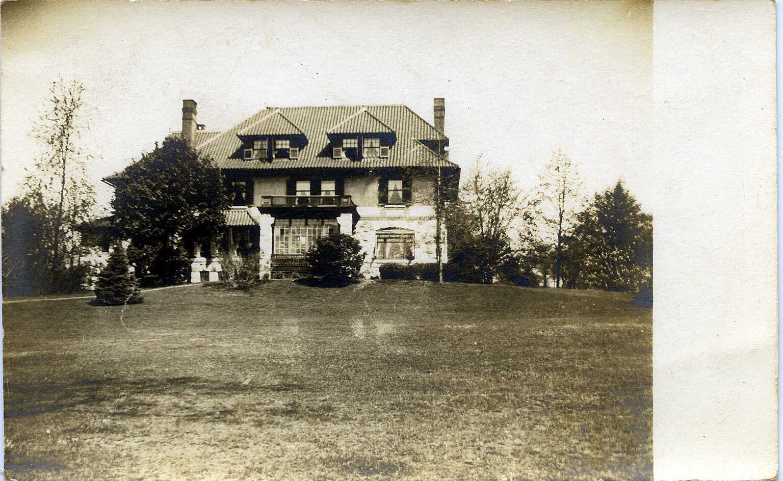 An undated, post-1907, postally unused, real-photo postcard of the back of 42 Western Drive in Short Hills. Handwritten on back of card is: "This is the house in which I lived in Short Hills N.J. The two windows over the front door was my room." Light foxing on back of card and slight yellowing of edges. Front of card shows a mark on the small tree in the left mid-ground. It seems to be a flaw in the photo and not a scratch on the card.Acquisition