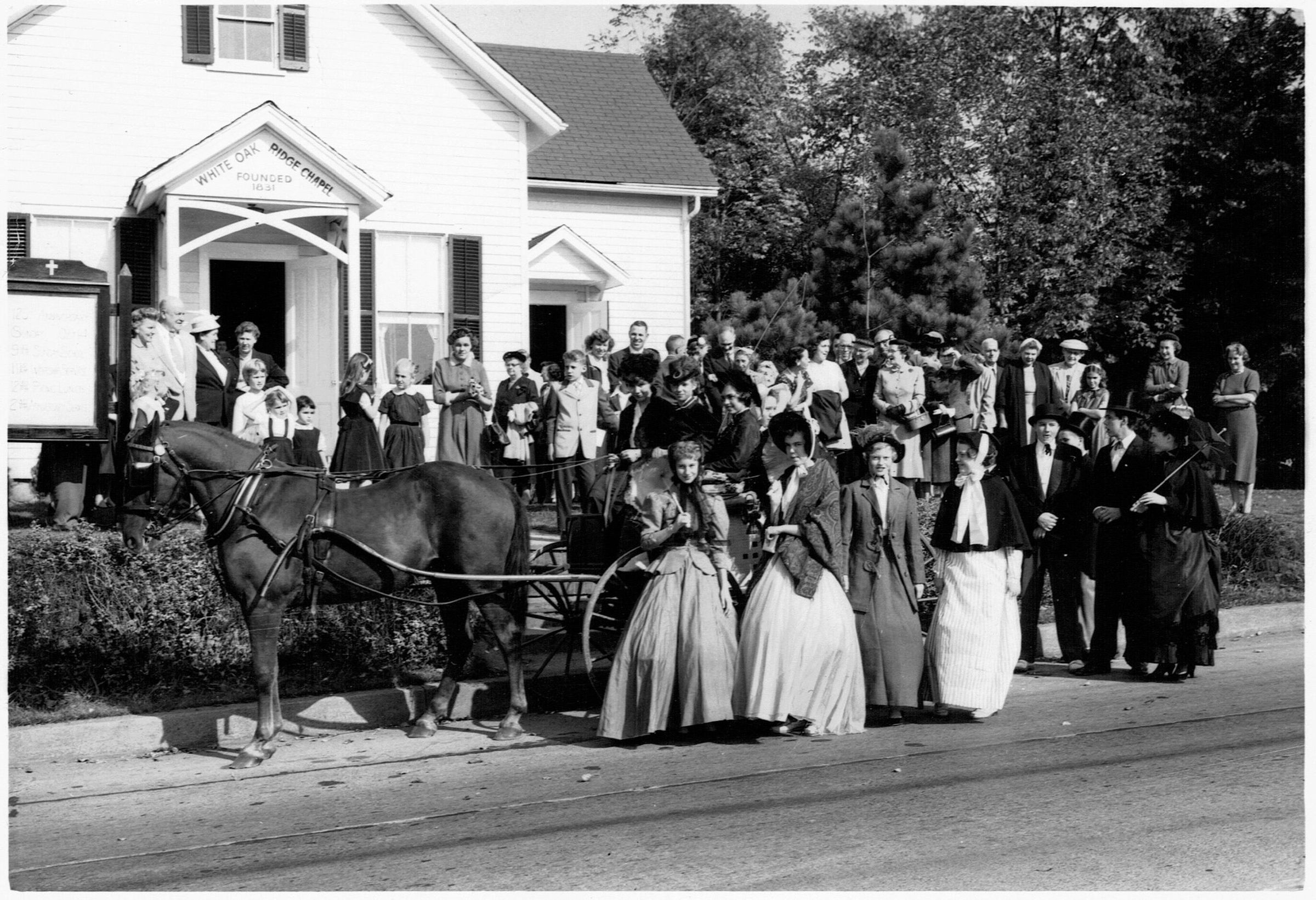 Photograph of White Oak Ridge Chapel at 291 Parsonage Hill Road. On October 14, 1956, members of the White Oak Ridge Chapel celebrated the 125th anniversary of its founding. The Chapel traces its origin to a meeting held by William Parsil in October 1831 to organize a Sunday School. Early meetings were held in homes, later in the wooden schoolhouse on White Oak Ridge Road and then in the chapel.