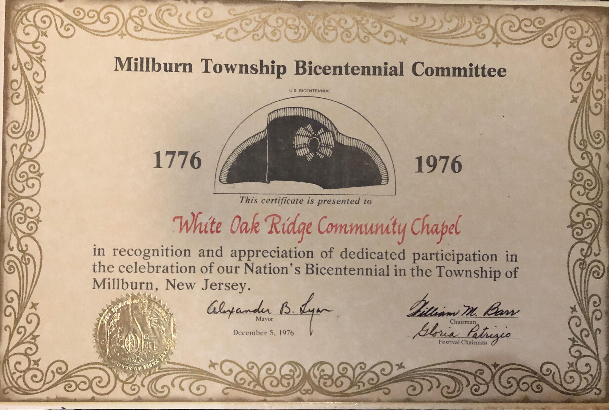 Certificate issued by the Millburn Township Bicentennial Committee to the White Oak Ridge Chapel Community Church recognizing participation in the Millburn Township Bicentennial Celebrations. Signed by Millburn Mayor Alexander B. Lyon, William Barr and Gloria Patrizio and dated December 6, 1976.Acquisition