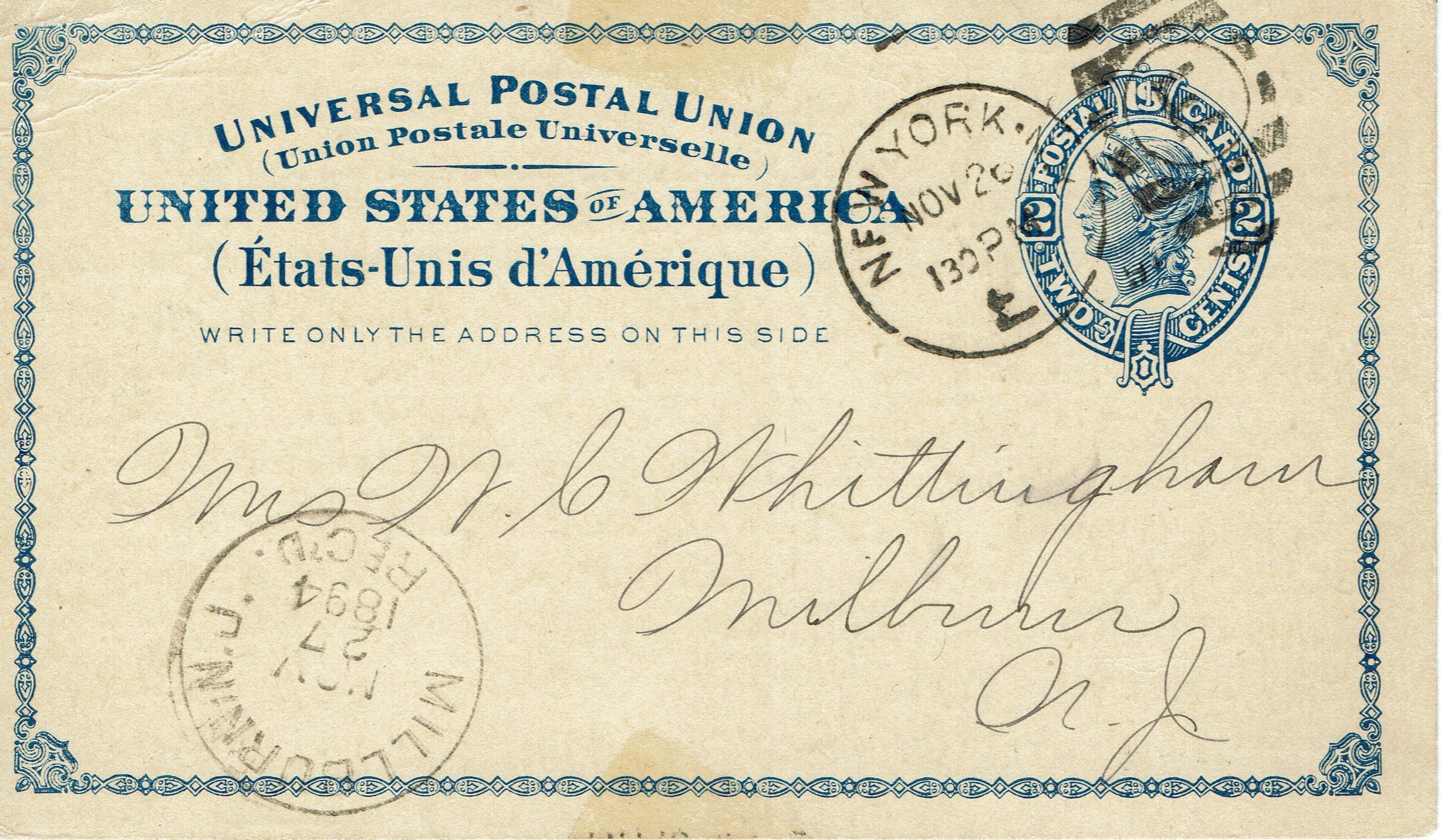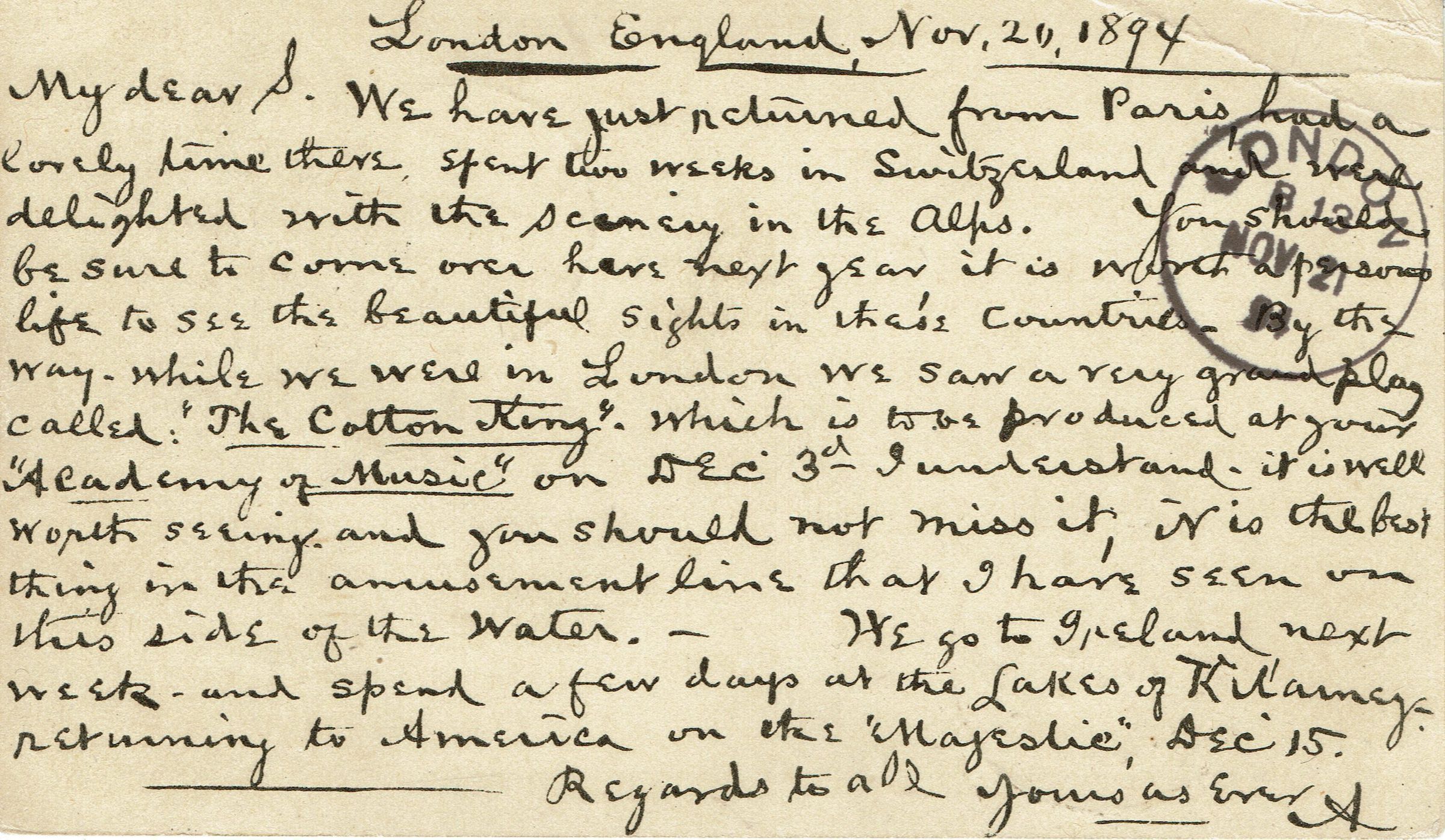 Postcard sent to Mrs. W. Whittingham, Millburn, N.J. postmarked from London, November 21, received in New York, November 26 at 1:30 pm and in Millburn, NJ November 27, 1894. Message is dated London, England, November 20, 1894. Message on postcard reads: "My dear S. We have just returned from Paris, had a lovely time there. Spent two weeks in Switzerland and were delighted with the scenery in the Alps. You should be sure to come over here next year, it is worth a person's life to see the beautiful sights in these countries. By the way-while we were in London, we saw a very good play called: "The Cotton Kind," which is to be produced at your "Academy of Music" on December 3rd--I understand. It is well worth seeing and you should not miss it. It is the best thing in the amusement line that I have seen on this side of the water. We go to Ireland next week and spend a few days at the Lakes of Killarney-returning to America on the "Majestic" December 15. Regards to all. Yours as Ever. A."Acquisition