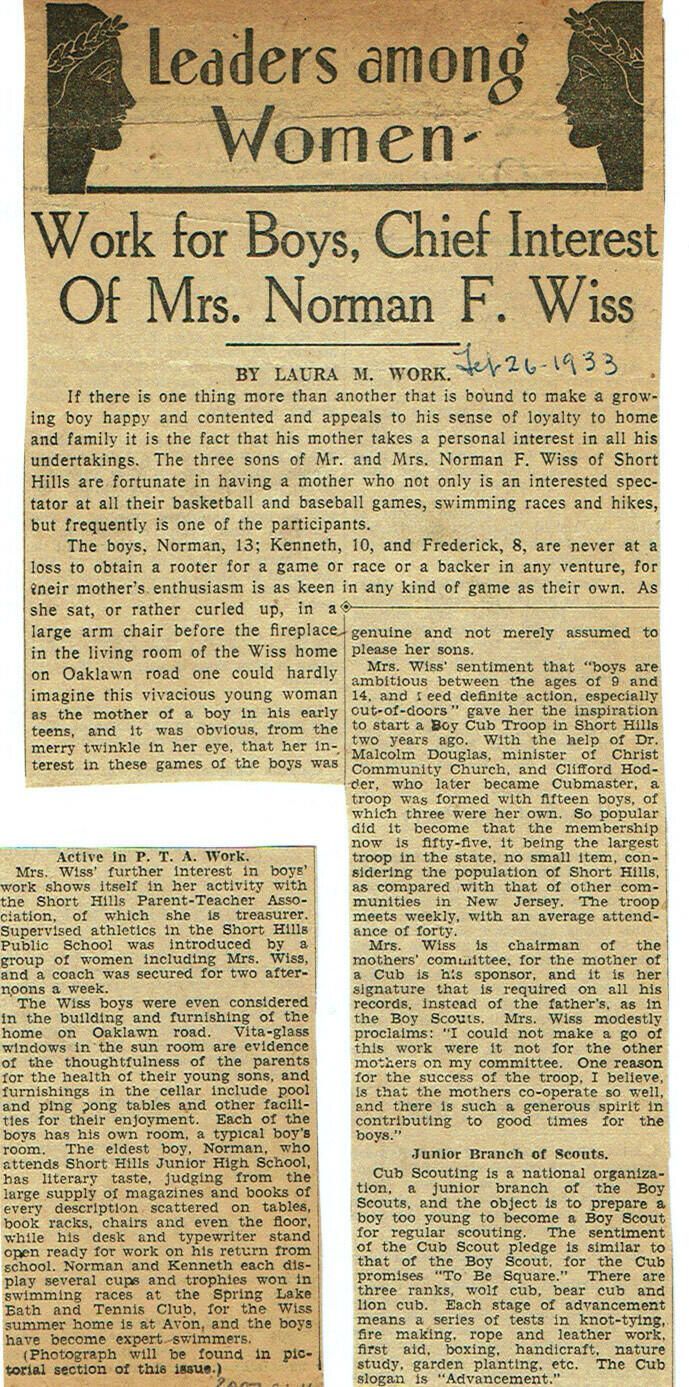 Article From February 26, 1933 newspaper discussing her leadership role in establishing the Cub Scouts in Short Hills. Several clippings and photographs from other newspapers of the time are also included.Collection