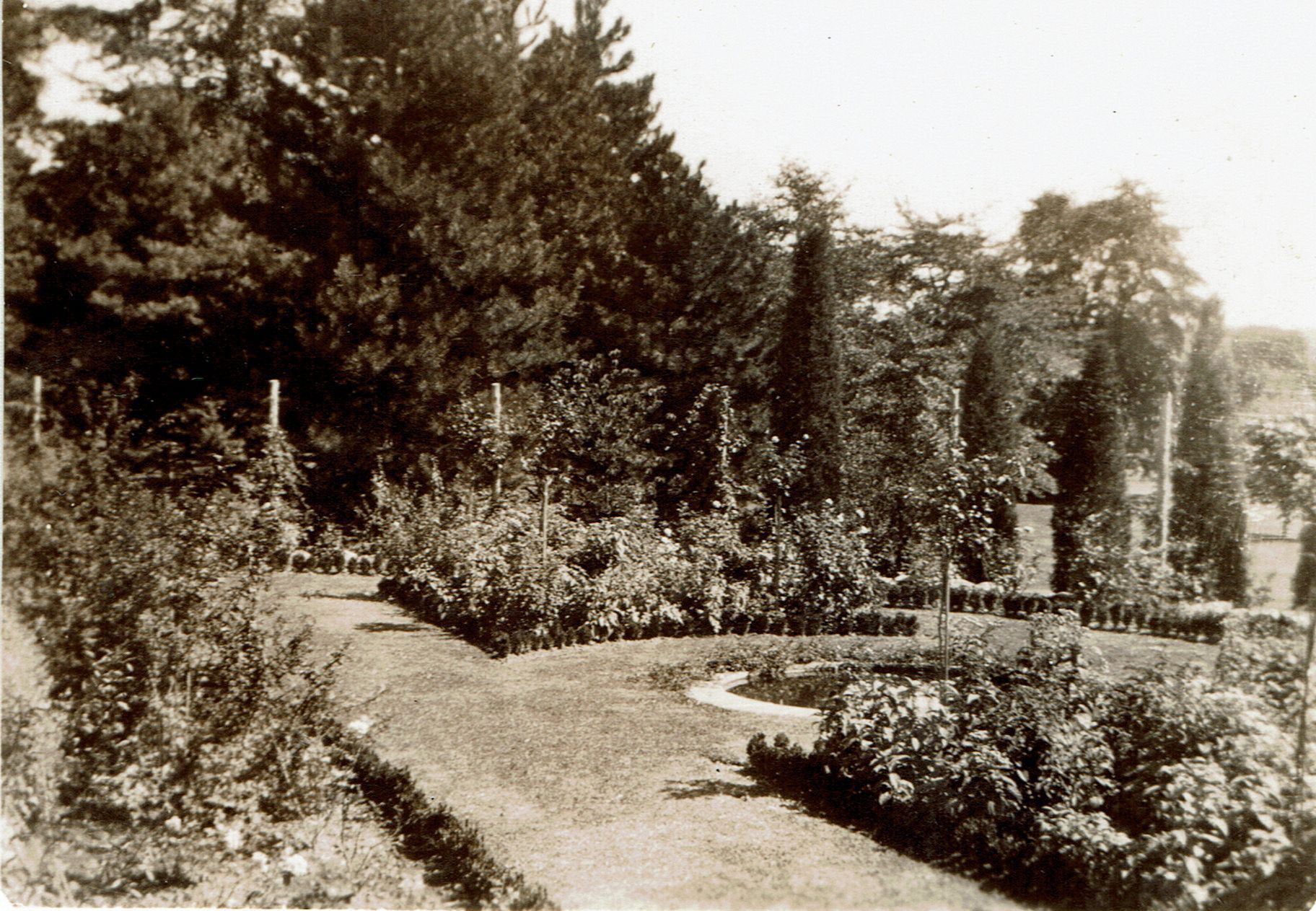1932 garden photo labeled in ink "lower rose garden", probably in the Bancroft Gherardi garden and probably installed by Helen Wodell of Wodell and Cottrell. Back of photo has "Sept 32" on it in pencil. Front of photo shows reflecting pool mid-ground, paths through plant beds, cypress(?) trees in background. Bancroft Gherardi lived in a 14 room home with greenhouse located on Parsonage Hill Road and Adams Avenue. His wife, Mary Butler Gherardi sold the property to W. Palin Conway in November 1942.Collection