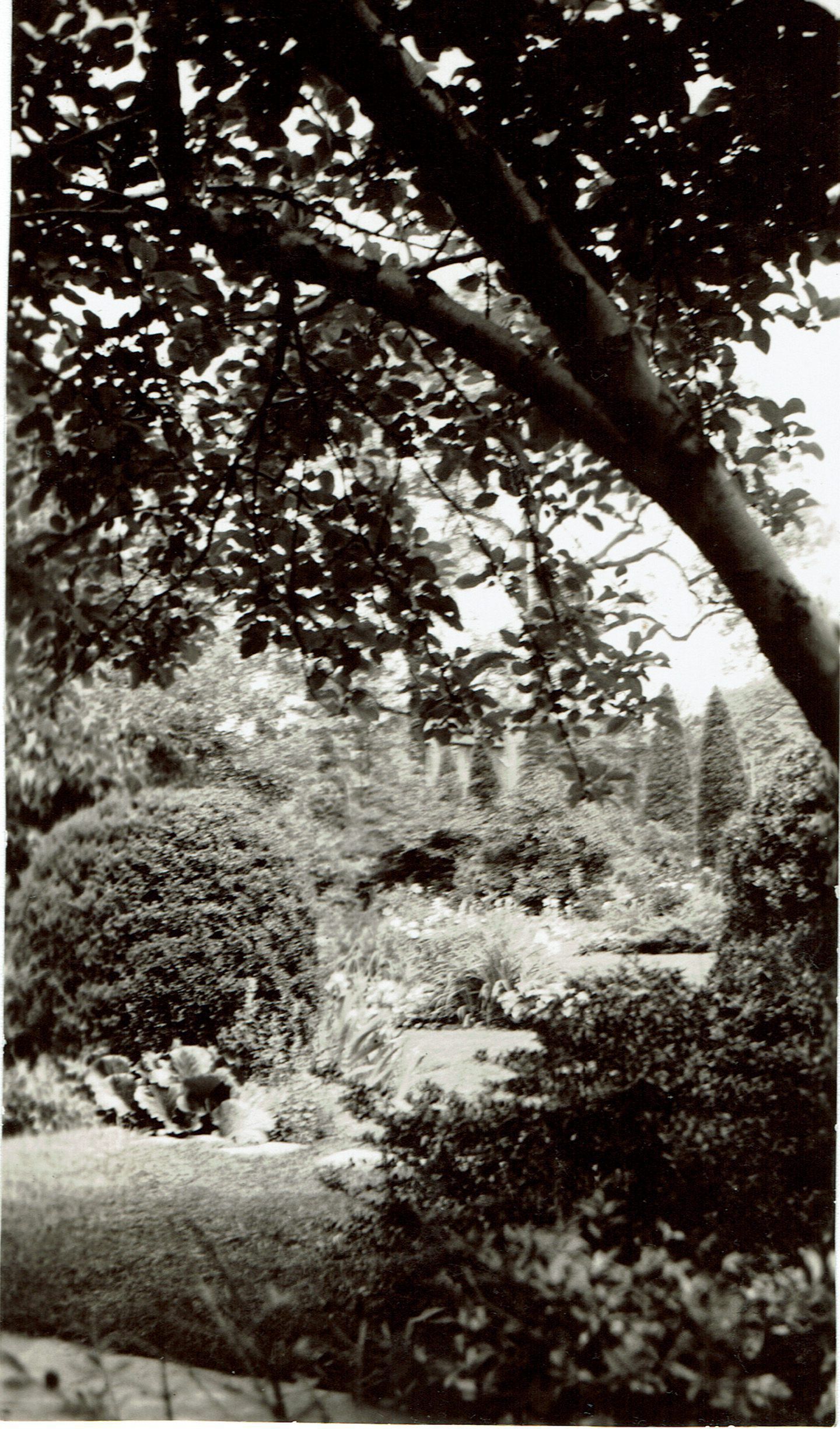 Black and white photograph of what was probably the Bancroft Gherardi garden, which was landscaped by Wodell and Cotrell. Tall cypress-type trees seen in background and trunk of a deciduous tree leans diagonally across the photo from left middle to upper right corner of the image. In pencil on back: "May 34"