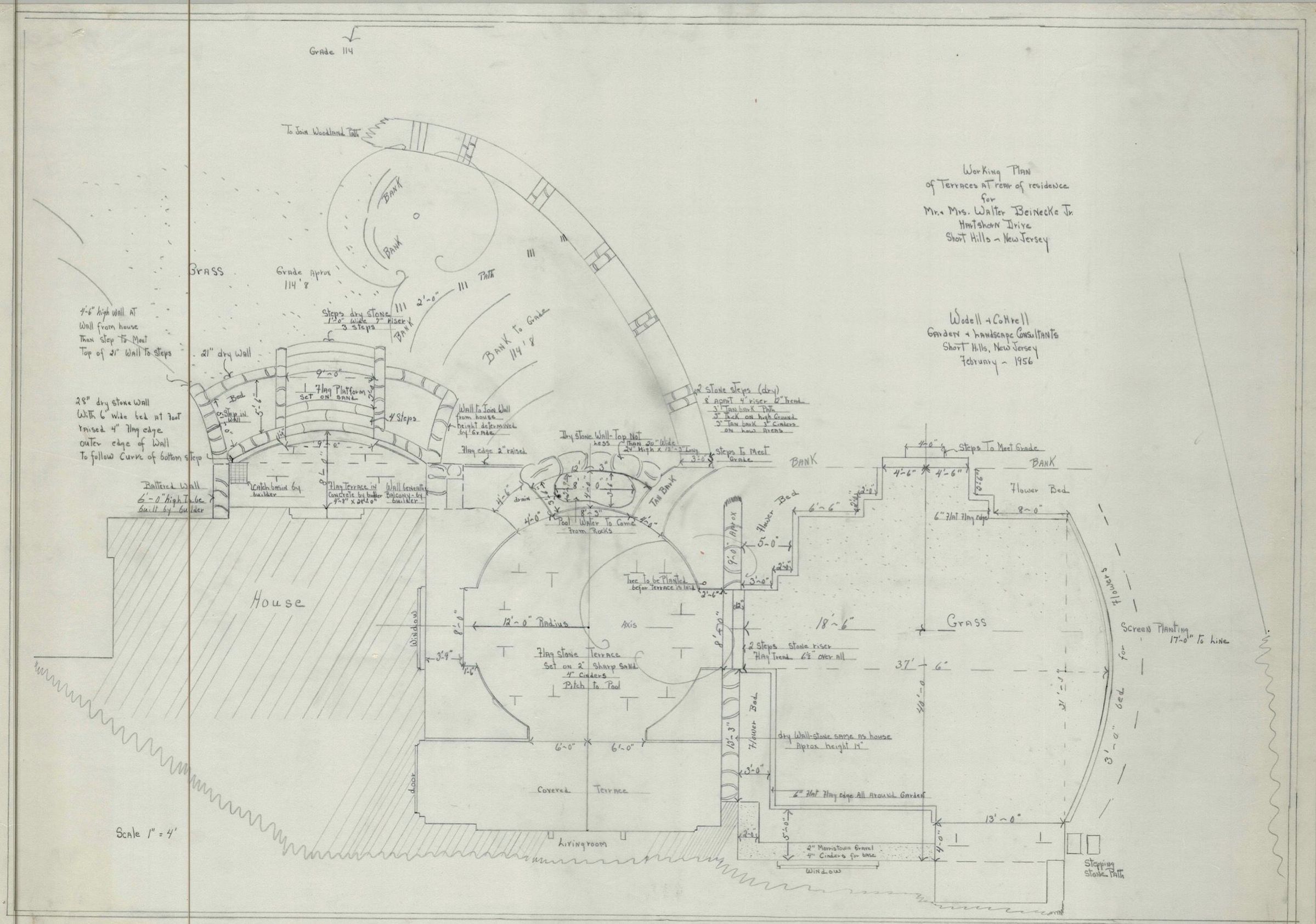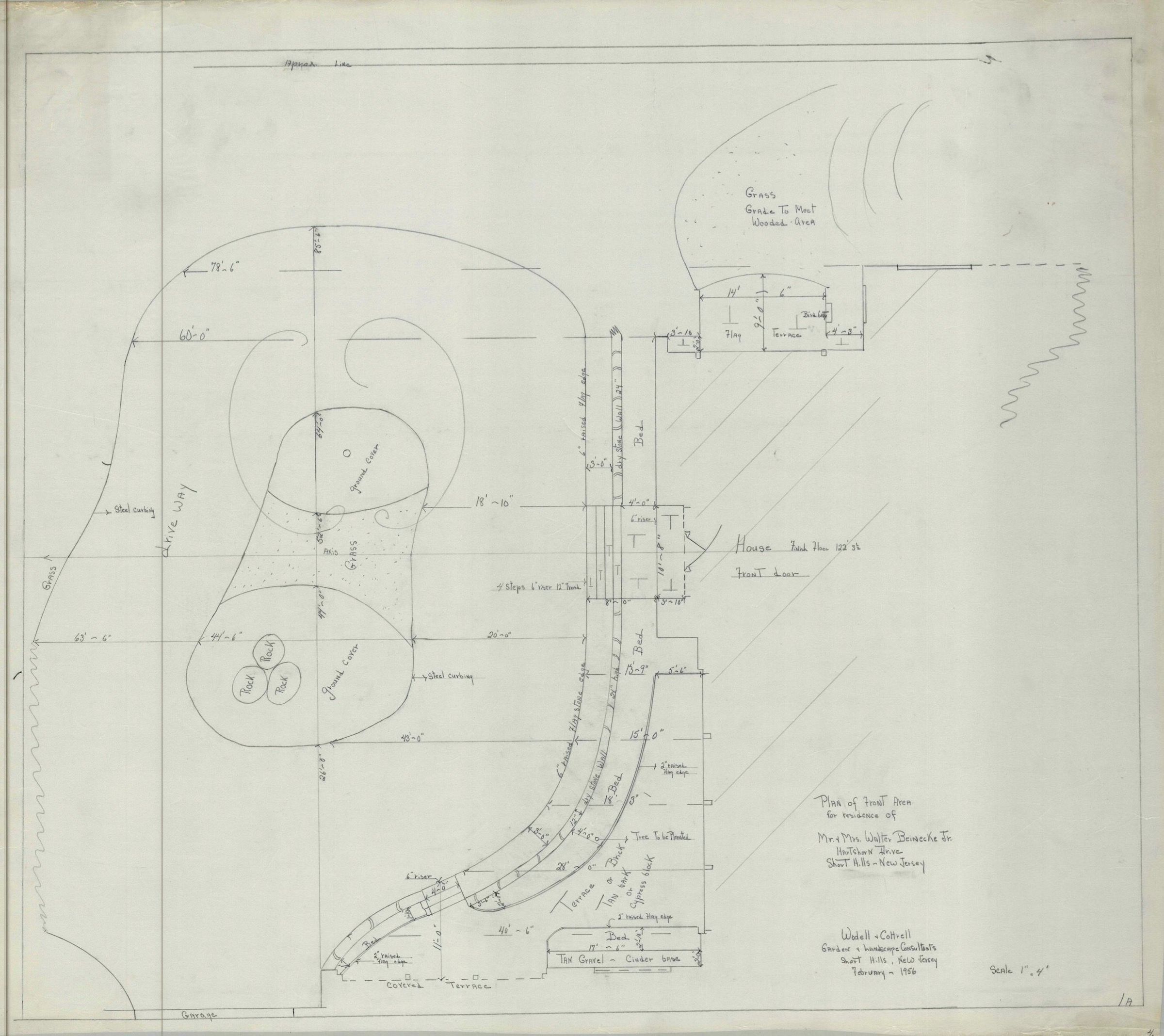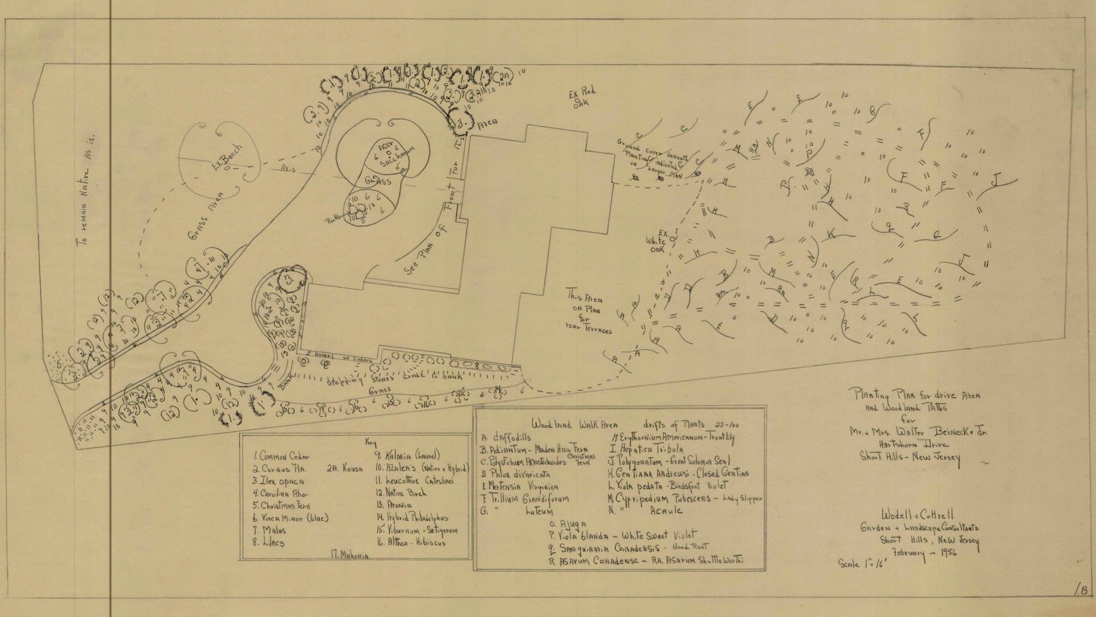 Wodell and Cottrell Landscaping Plans for the residence of Mr. and Mrs. Walter, Beinecke, Jr., 245 Hartshorn Drive, Short Hills, New Jersey, February 1956. 1. Planting plans for the front area of the residence, 2. Suggestions for planting in the rear of the residence, 3. Working plan for terraces at the rear of the residence, 4. Plan of the front area, 5. Proposed terraces at rear of residence 6. Planting Plan for drive area and woodland patio.Collection