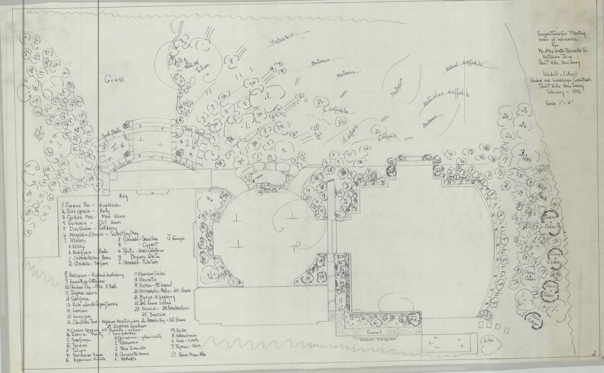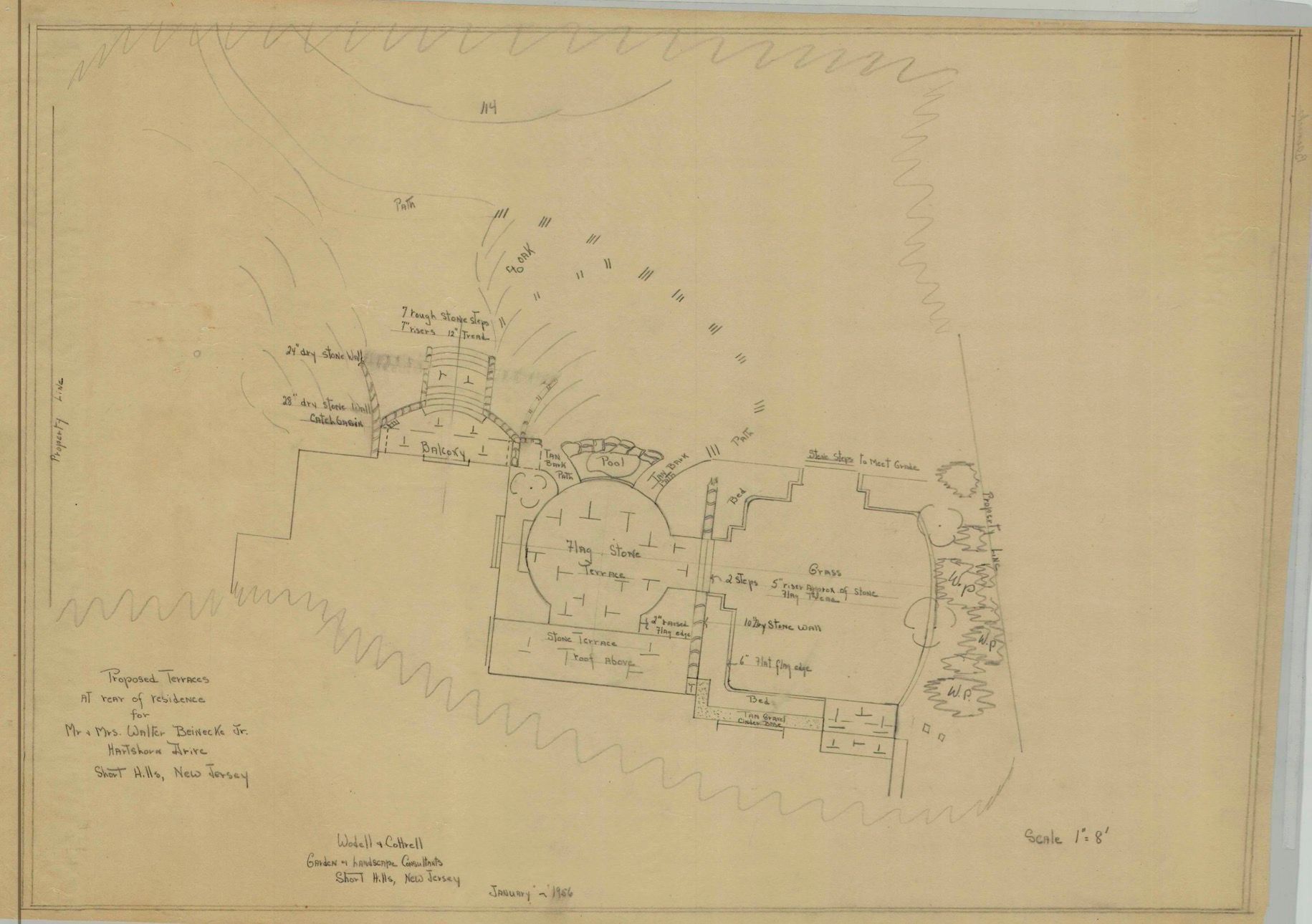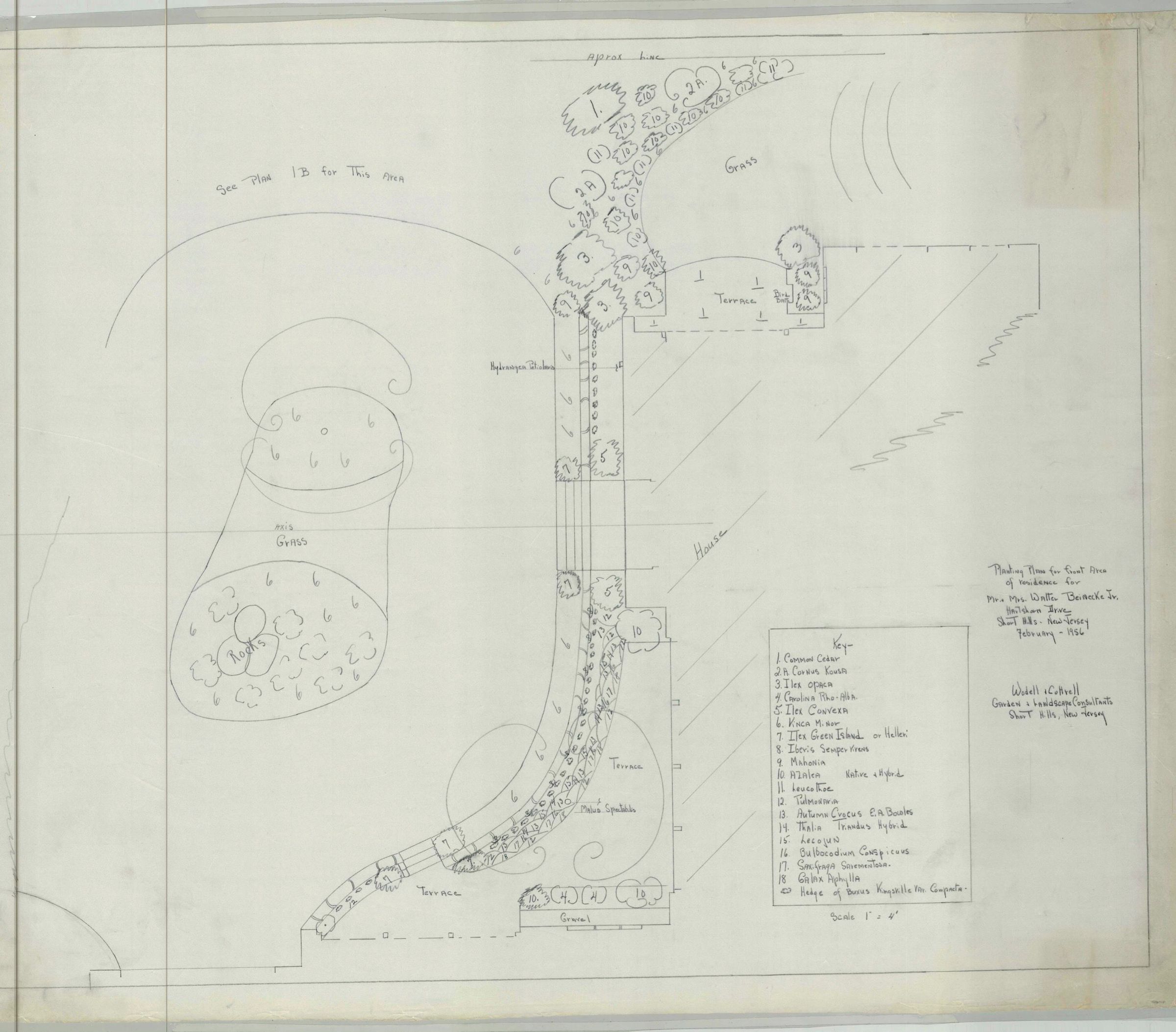Wodell and Cottrell Landscaping Plans for the residence of Mr. and Mrs. Walter, Beinecke, Jr., 245 Hartshorn Drive, Short Hills, New Jersey, February 1956. 1. Planting plans for the front area of the residence, 2. Suggestions for planting in the rear of the residence, 3. Working plan for terraces at the rear of the residence, 4. Plan of the front area, 5. Proposed terraces at rear of residence 6. Planting Plan for drive area and woodland patio.Collection