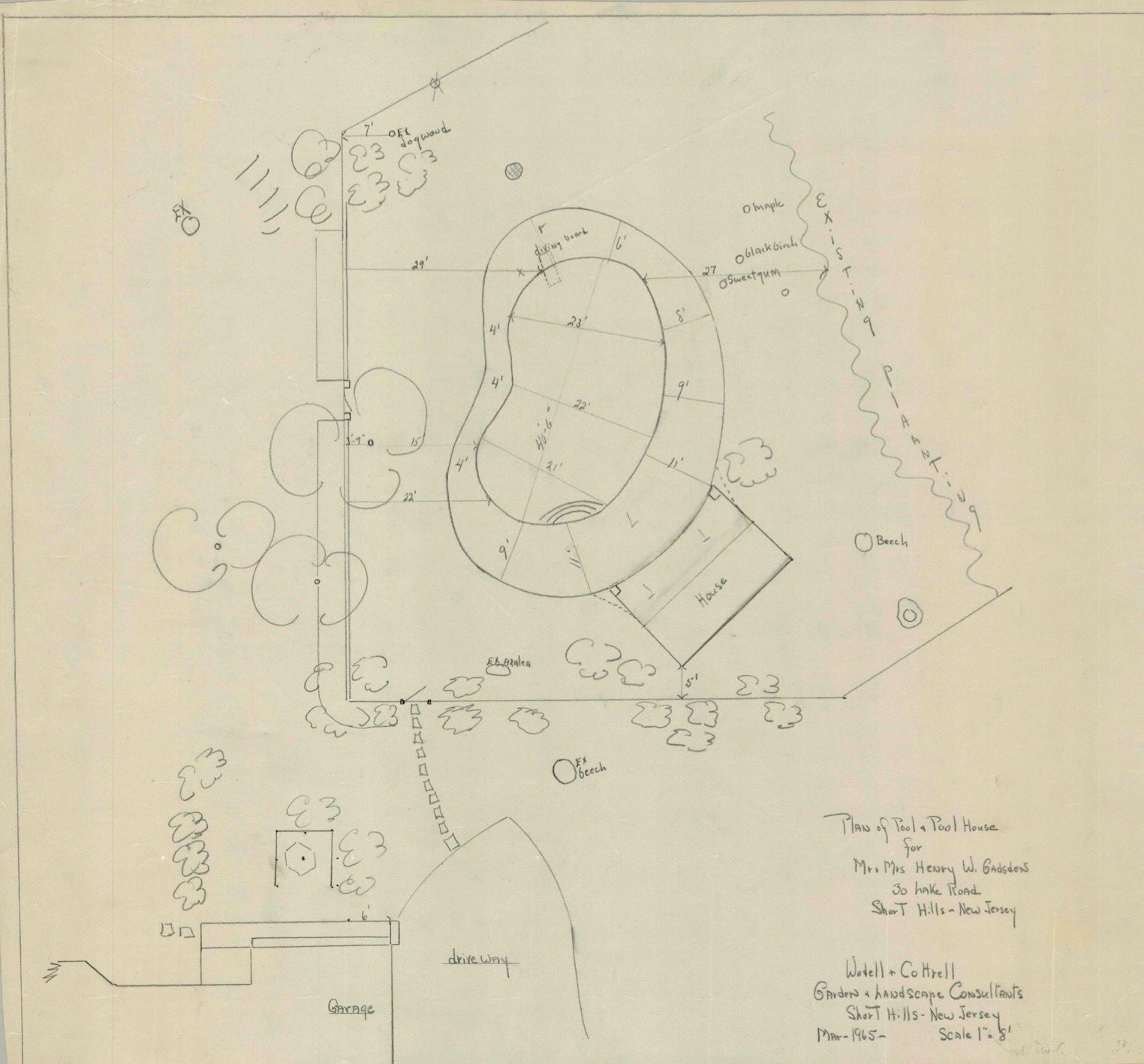 Wodell and Cottrell plan of pool and pool house for Mr. and Mrs. Henry W. Gadsdens, 30 Lake Road, Short Hills, March 1965.Collection