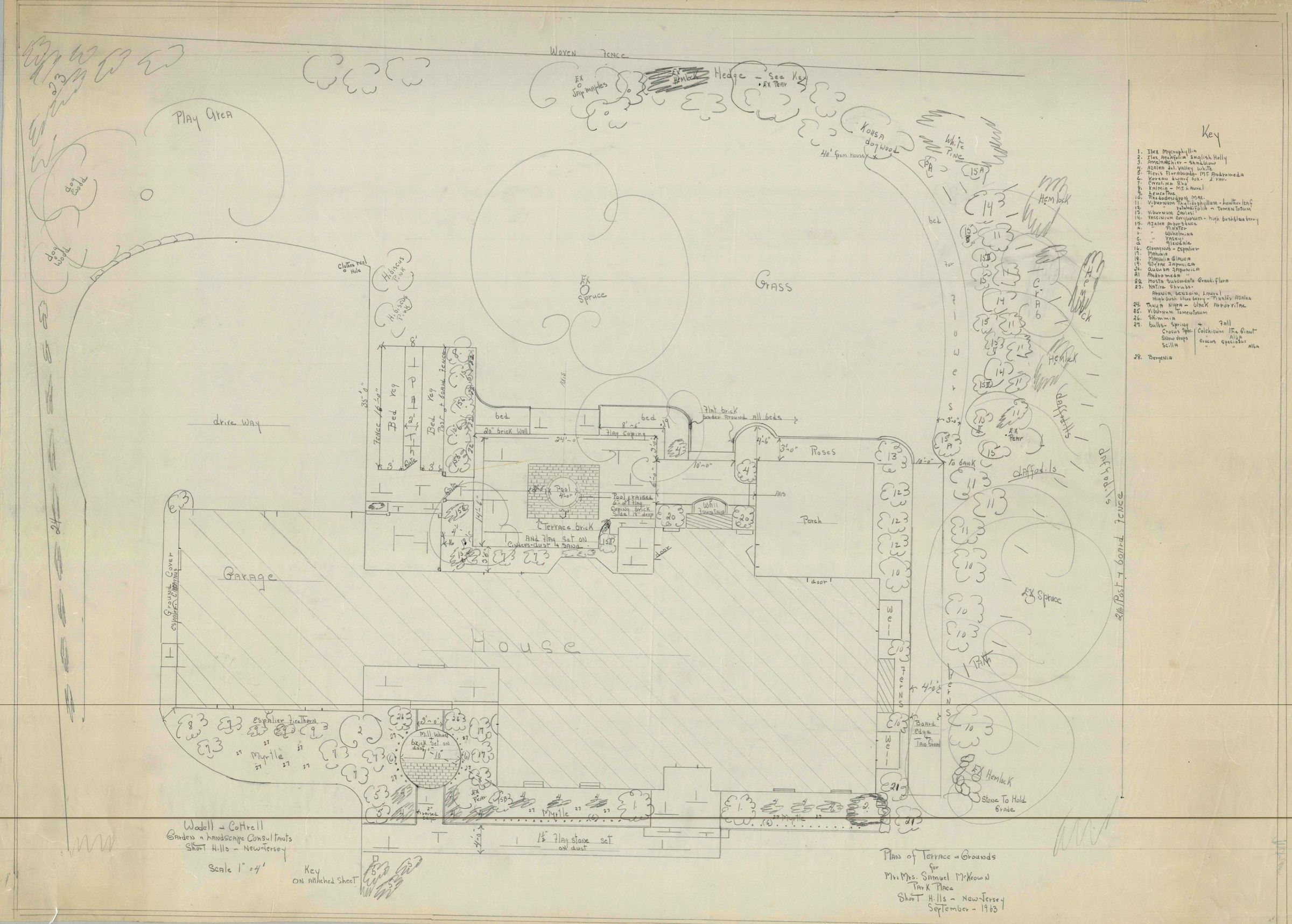 Wodell and Cottrell plan of terrace and grounds for Mr. and Mrs. Samuel McKeown, 8 Park Place, Short Hills, New Jersey, September 1963. Samuel A. McKeown was the vice president and manager of the Fidelity Union Trust Co., East Orange.Collection