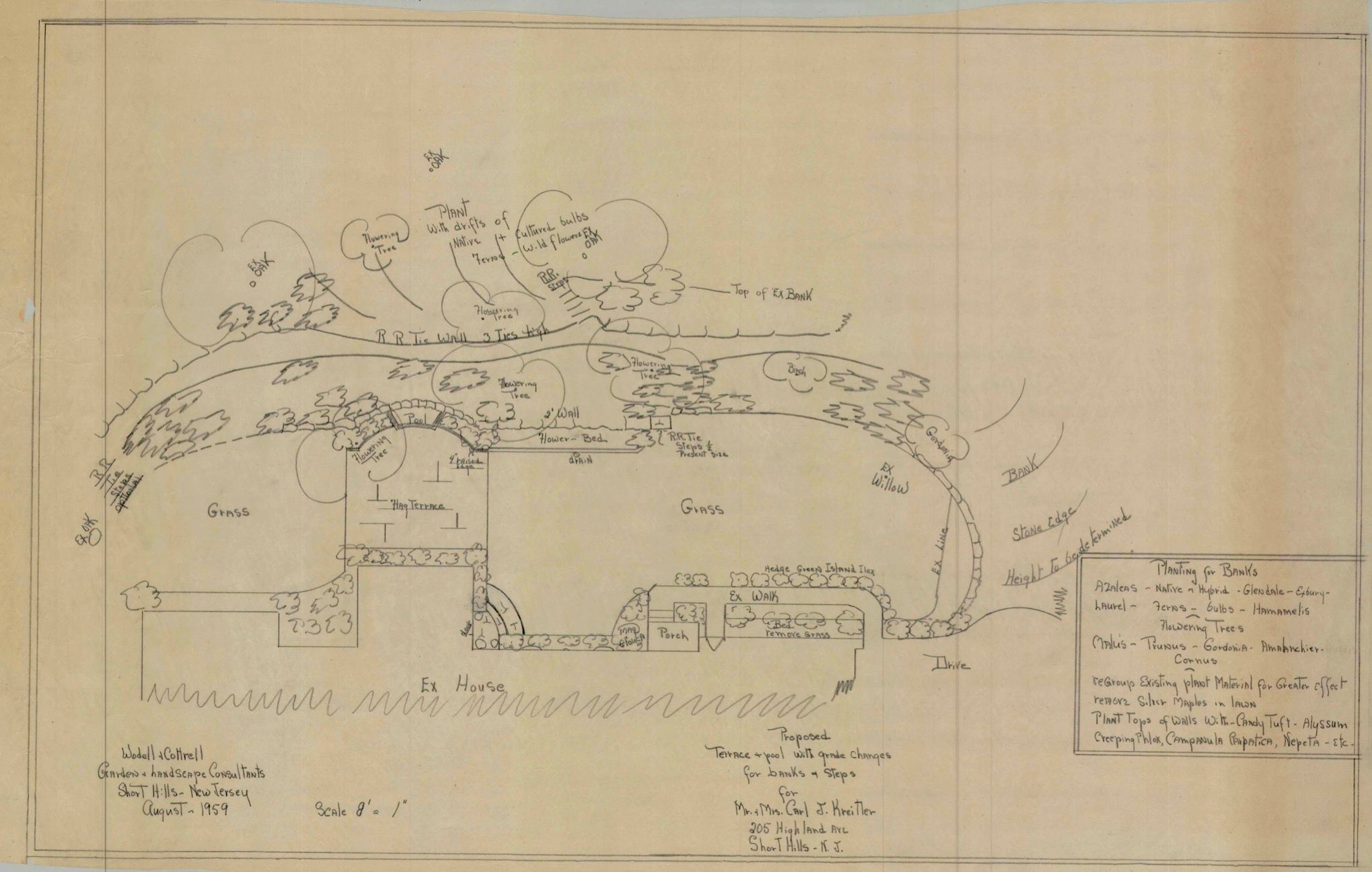 Wodell and Cottrell terrace and pool design with grade changes for banks and steps for Mr. and Mrs. Carl J. Kreiter, 205 Highland Avenue, Short Hills, August 1959.Collection