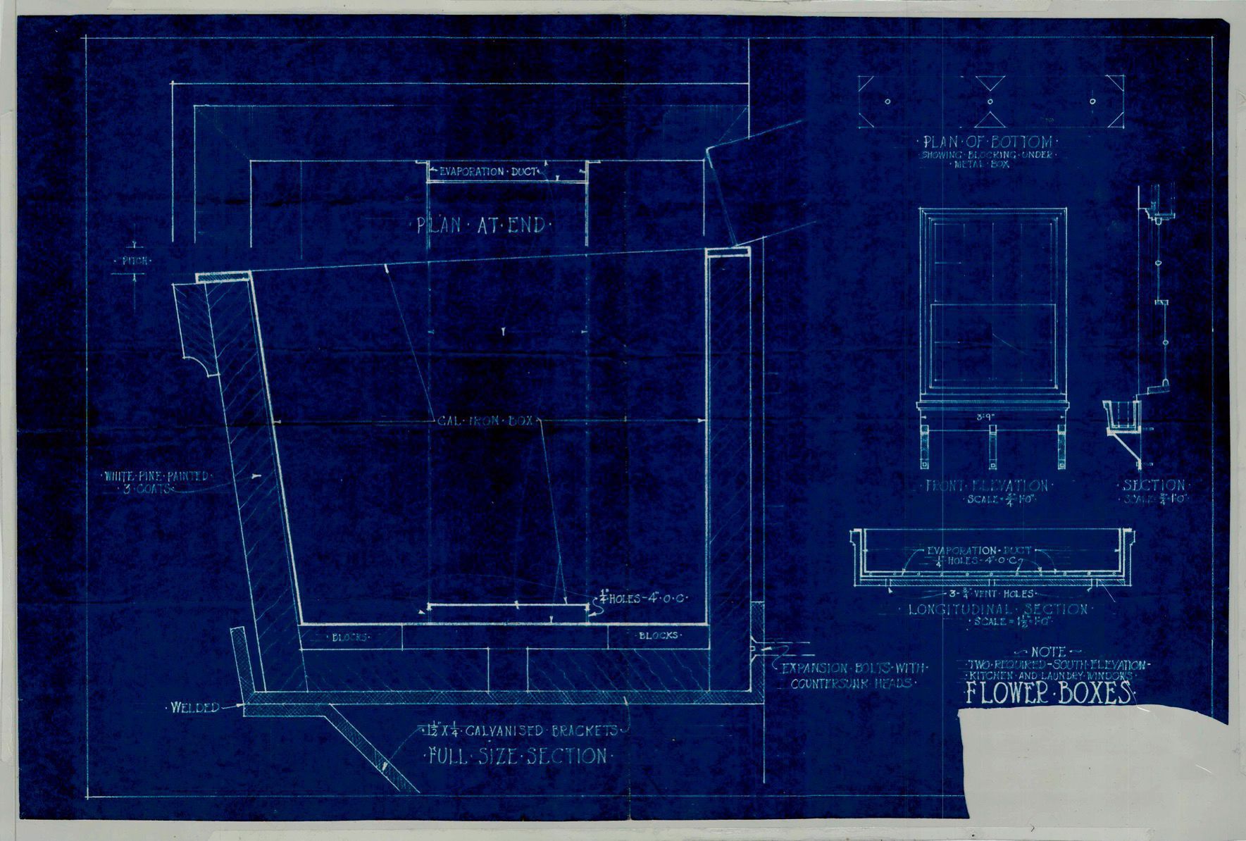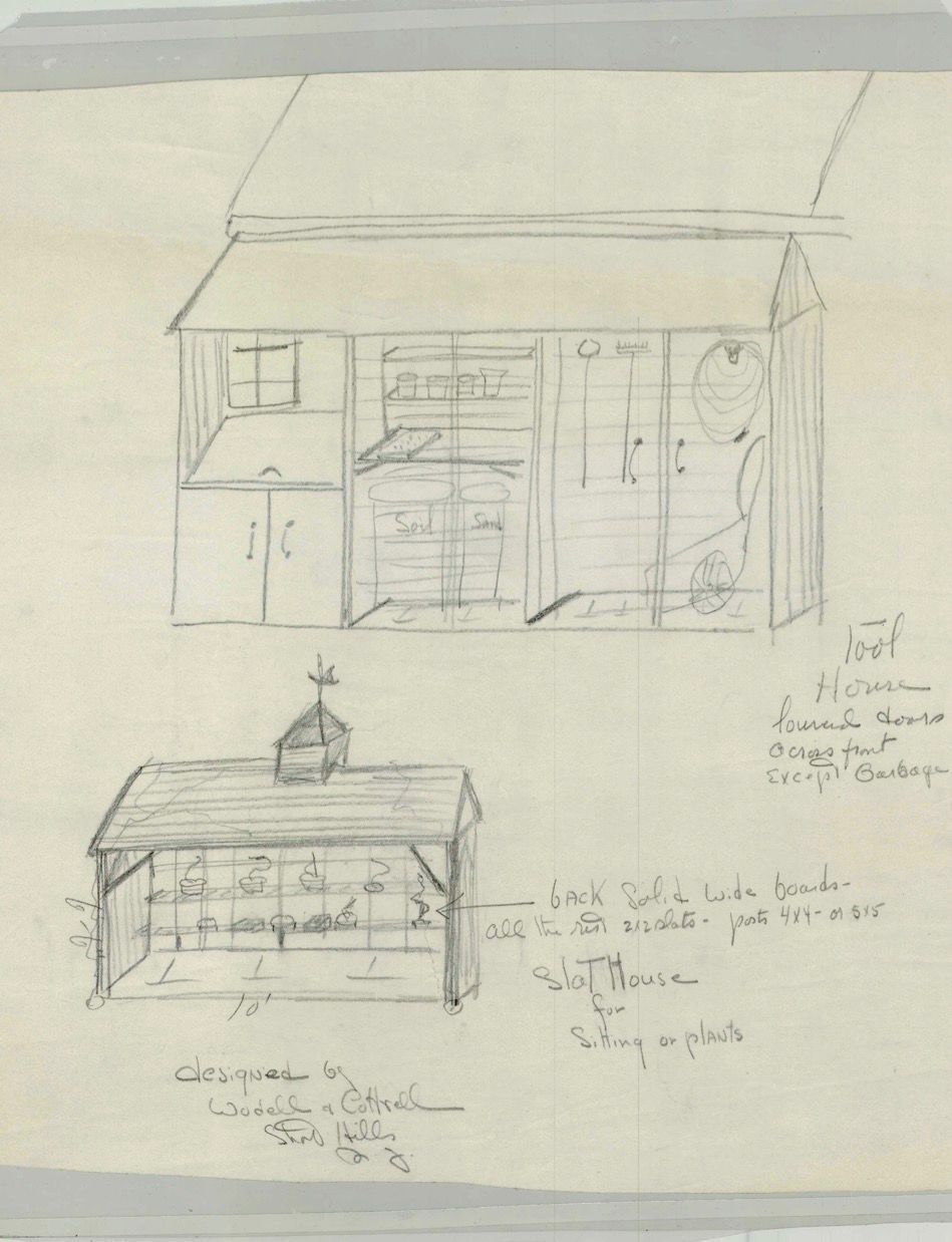 Wodell & Cottrell designs for a tool house with louvered doors across the front except for the garbage area. Design for a slott house for sitting or for plants (undated). Design for flower boxes.Collection