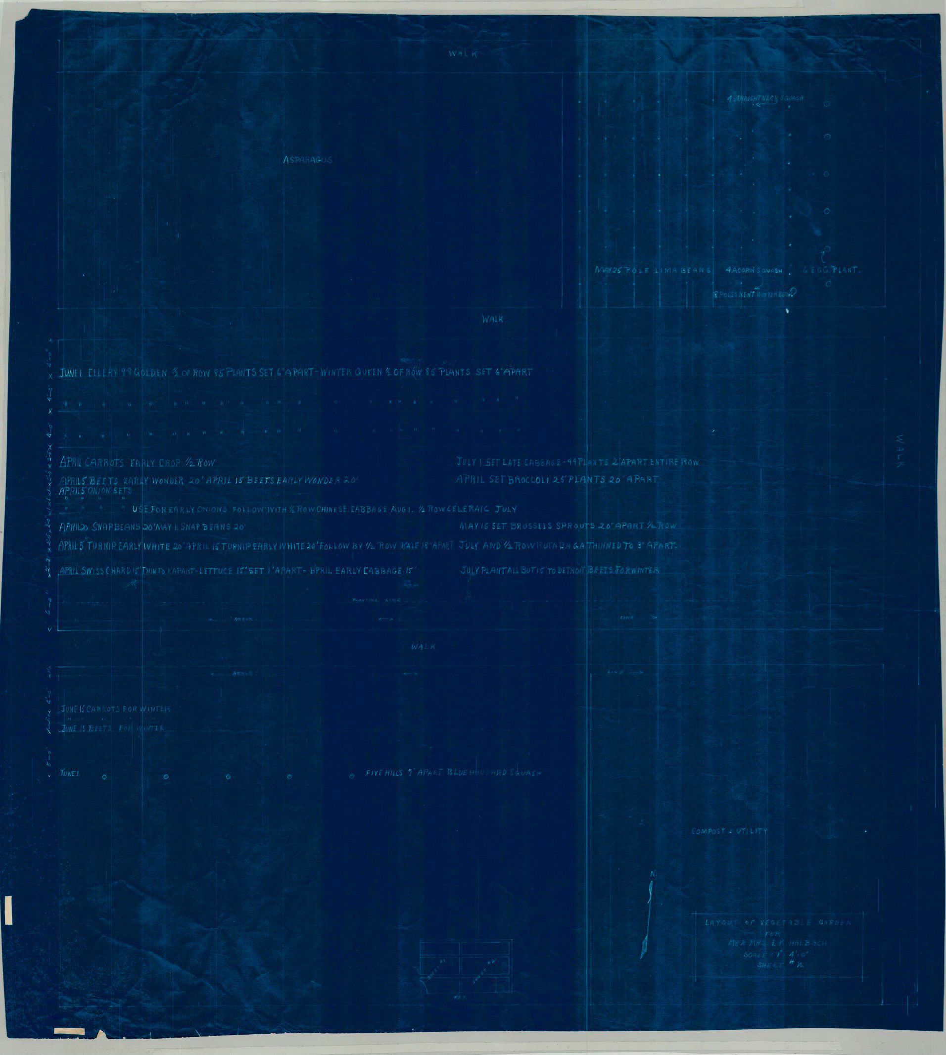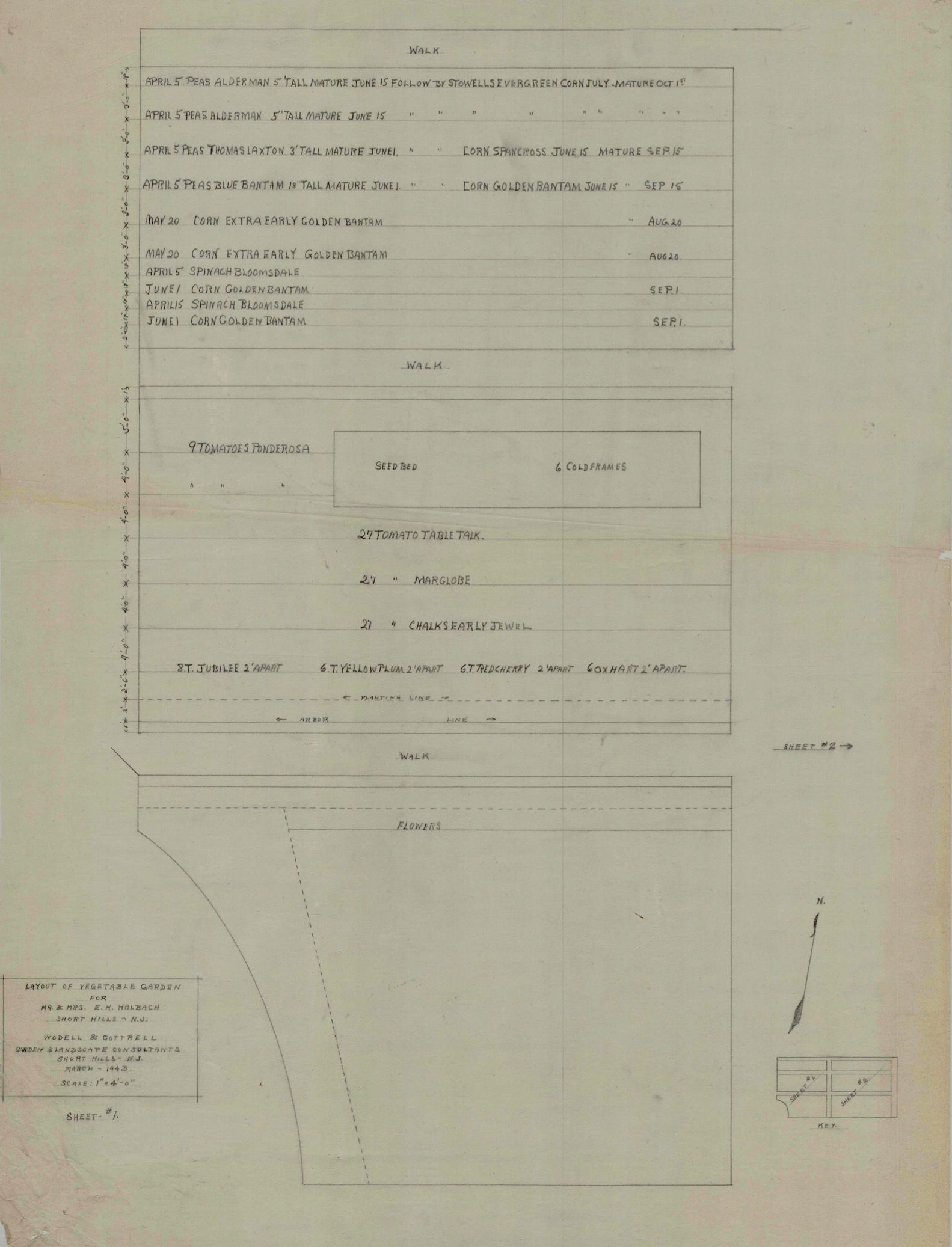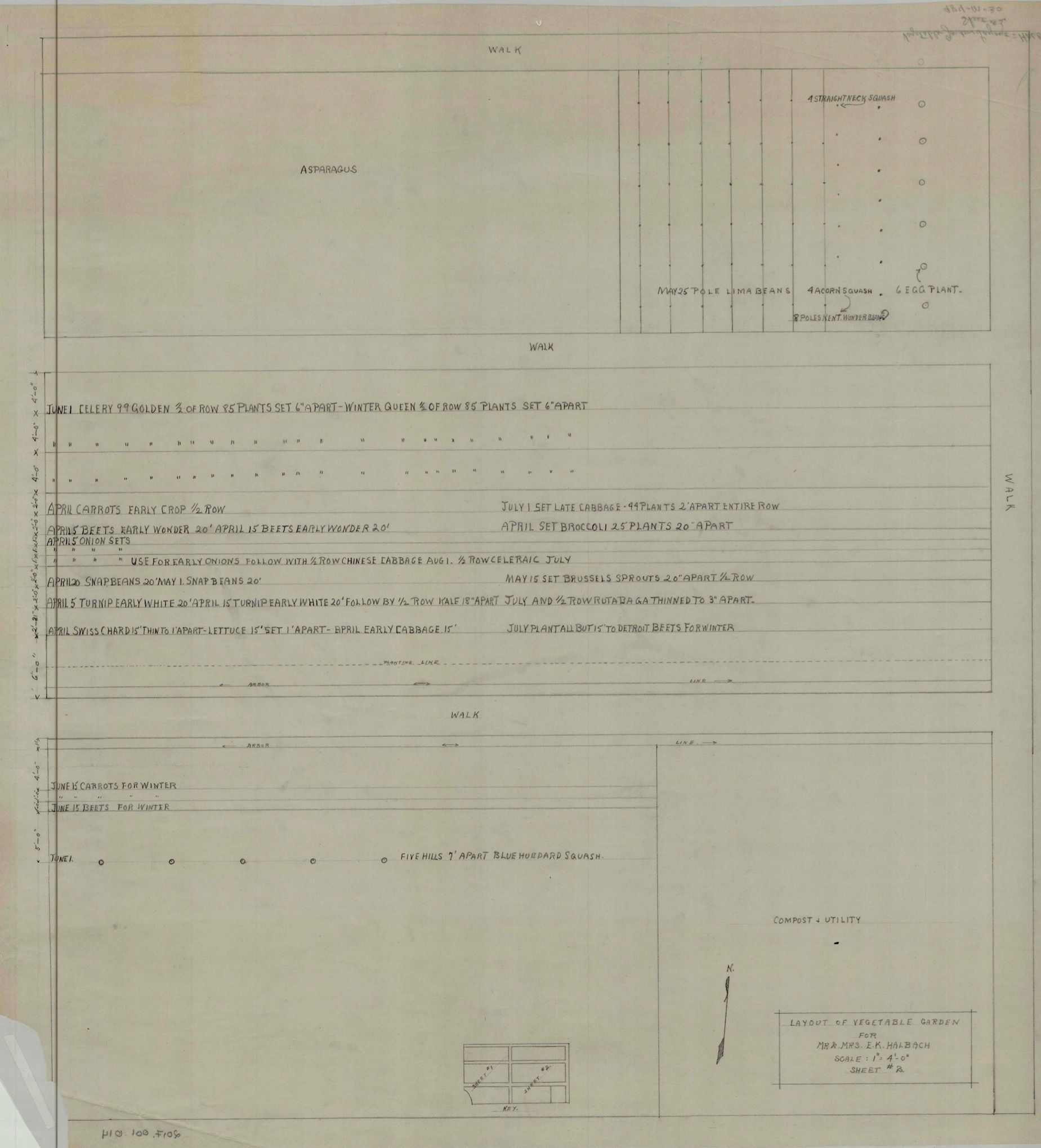 Wodell and Cottrell layout for a vegetable garden for Mr. and Mrs. E.K. Halbach (Sheets # 1 & #2), March 1943. Blueprint copy and drawing.Collection