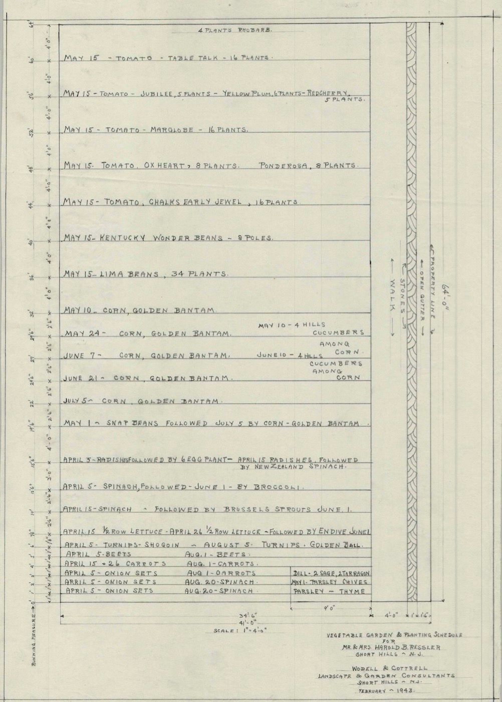 Wodell & Cottrell vegetable garden and planting schedule for Mr. and Mrs. Harold B. Ressler, Highland Avenue, Short Hills, from February 1943. The Resslers lived on Highland Avenue from c. 1938-September 1944.Collection