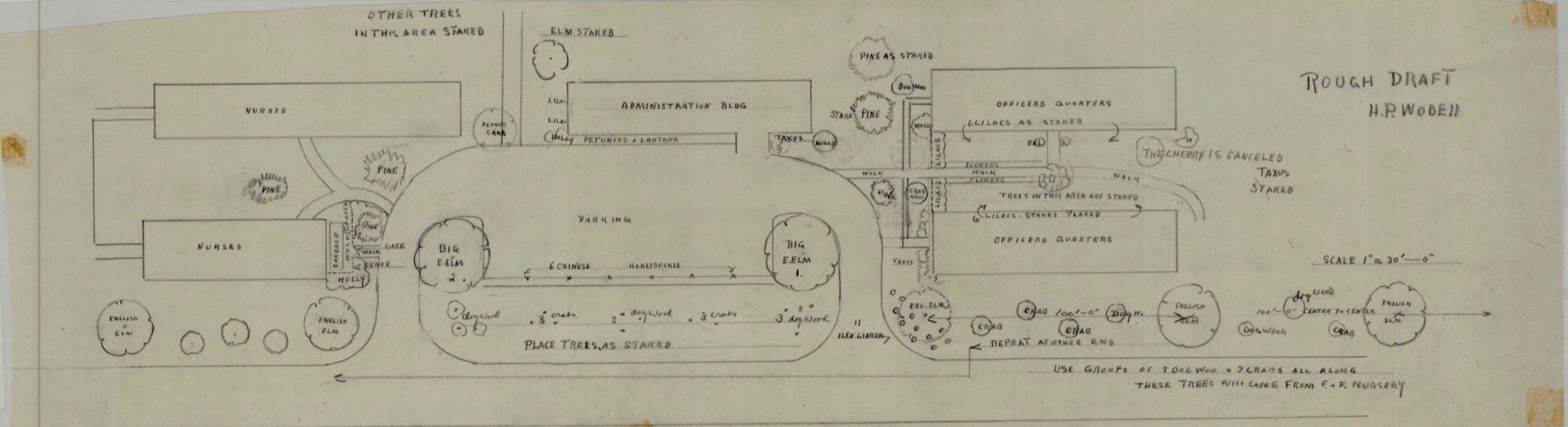 Helen P. Wodell rough draft of a planting plan for a hospital, possibly military. Location unknown. Undated.Collection