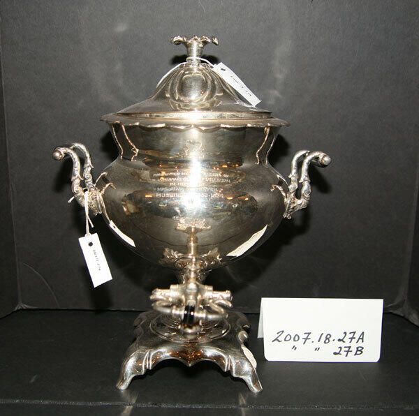Silverplate (?) coffee urn from Woman's Club of Millburn. Donated upon their disbanding. Pieces of silver had apparently been purchased when a new Woman's Club president left office (or started?).