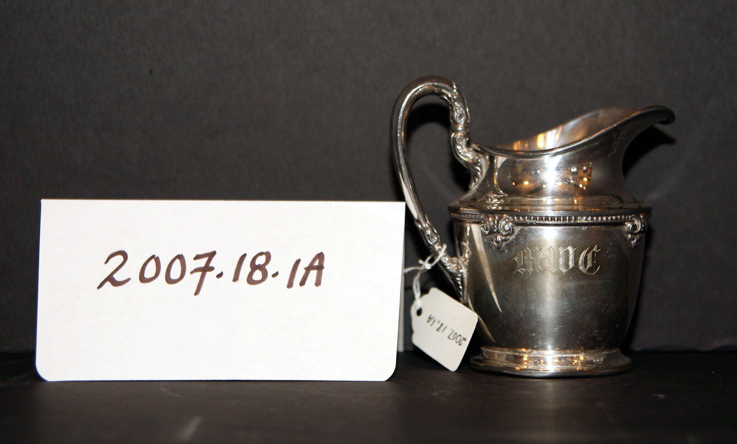 Silverplate creamer from Woman's Club of Millburn donation, upon their disbanding. Pieces of silver had apparently been purchased when a new Woman's Club president left office (or started?). This piece is engraved "MWC". Bottom has the following marks: "EPNS" (Electro Plated Nickel Silver?) and "C260".Acquisition