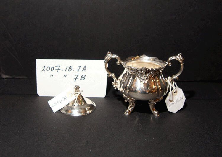 Silverplate Wallace lidded sugar bowl from Woman's Club of Millburn donation, upon their disbanding. Pieces of silver had apparently been purchased when a new Woman's Club president left office (or started?). This piece is not engraved. Bottom has an aqua and silver adhesive label for "Wallace Silverplate; Made in USA" and the following marks: "Wallace" and "=283=".Acquisition