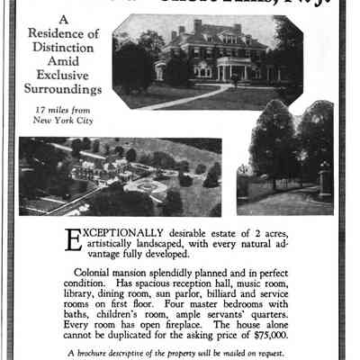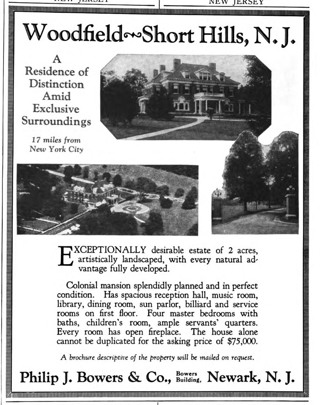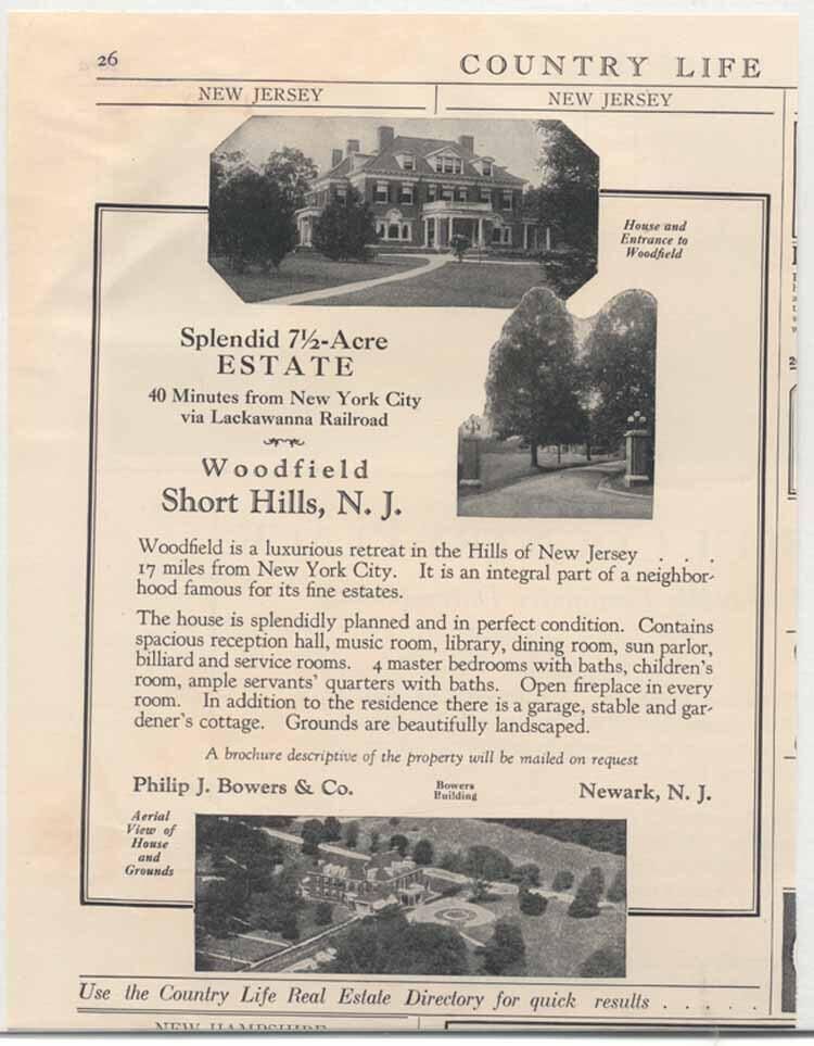 Advertisement from Country Life Magazine, probably c. 1927 for the Woodfield Estate in Short Hills. The house was designed by architect Ernest Greene was part of John and Gertrude Taylor Estate, off Old Short Hills Road. The property was purchased by Philip J. Bowers & Co., who would sell lots from the larger estate to form the Woodfield Estates Development.Acquisition