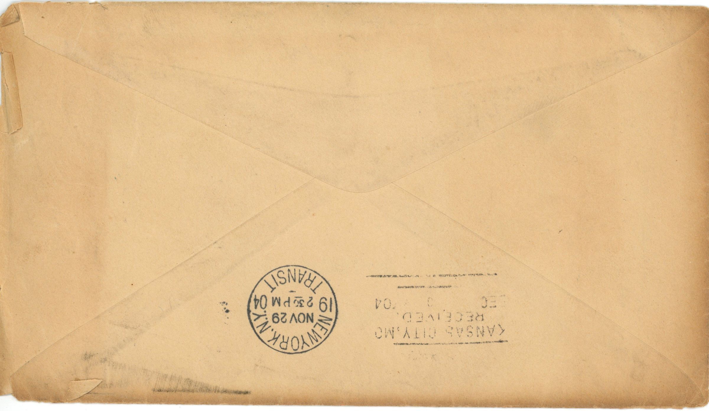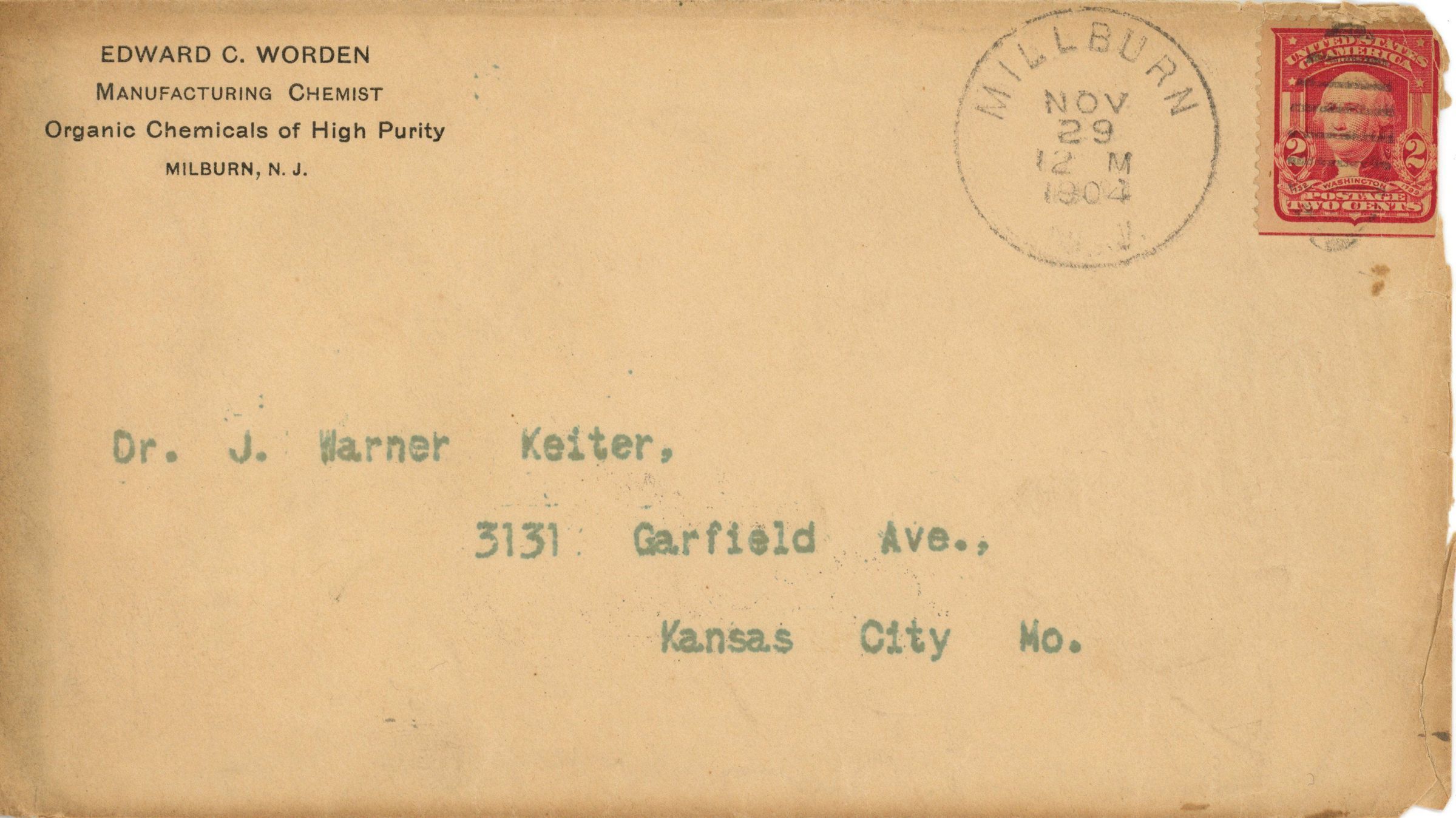 Postally used envelope addressed to Dr. J. Warner Keiter, 3131 Garfield Avenue, Kansas City from Edward C. Worden, Manufacturing Chemist, Organic Chemicals of High Purity, Millburn, N.J. postmarked Millburn, November 29, 1904, 12 M. Postmark on verso is New York, NY Transit, November 29, 1904, 2:30 pm. Kansas City, Mo., received December (?) 1904.