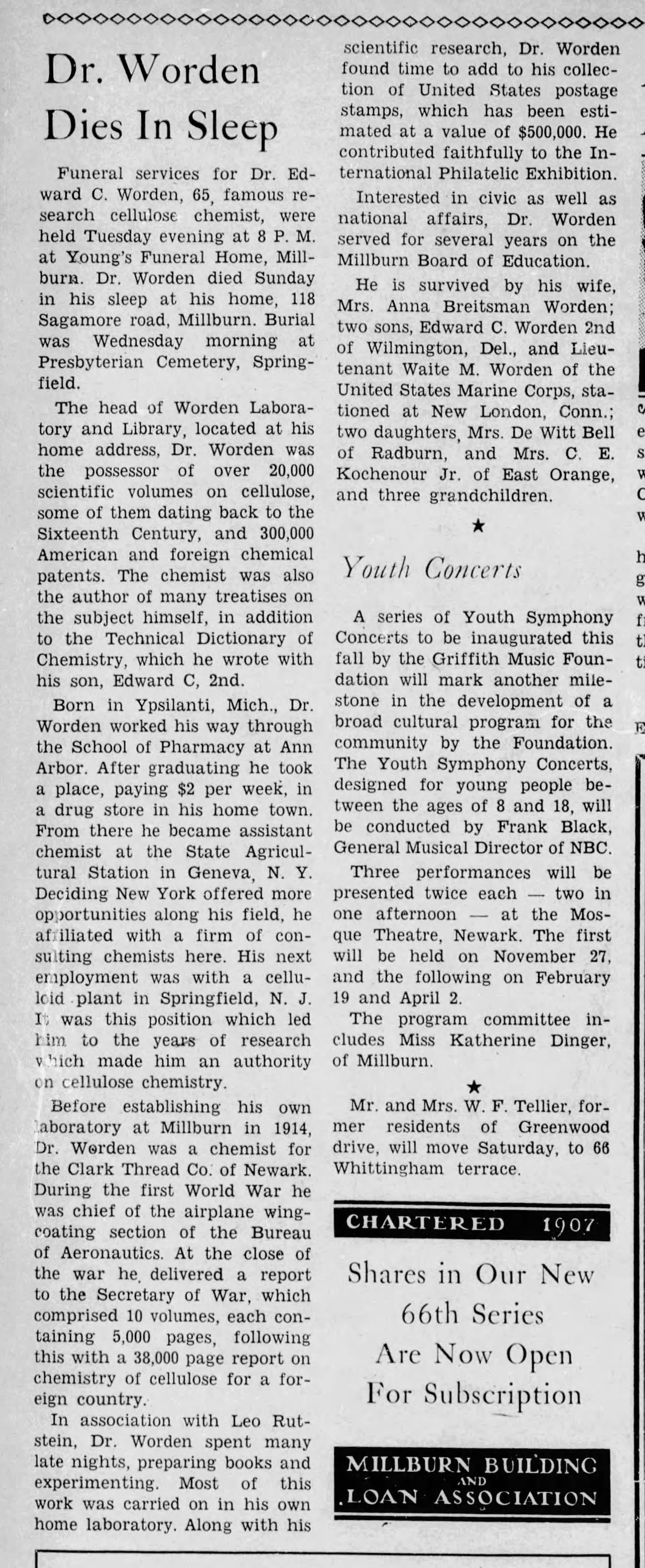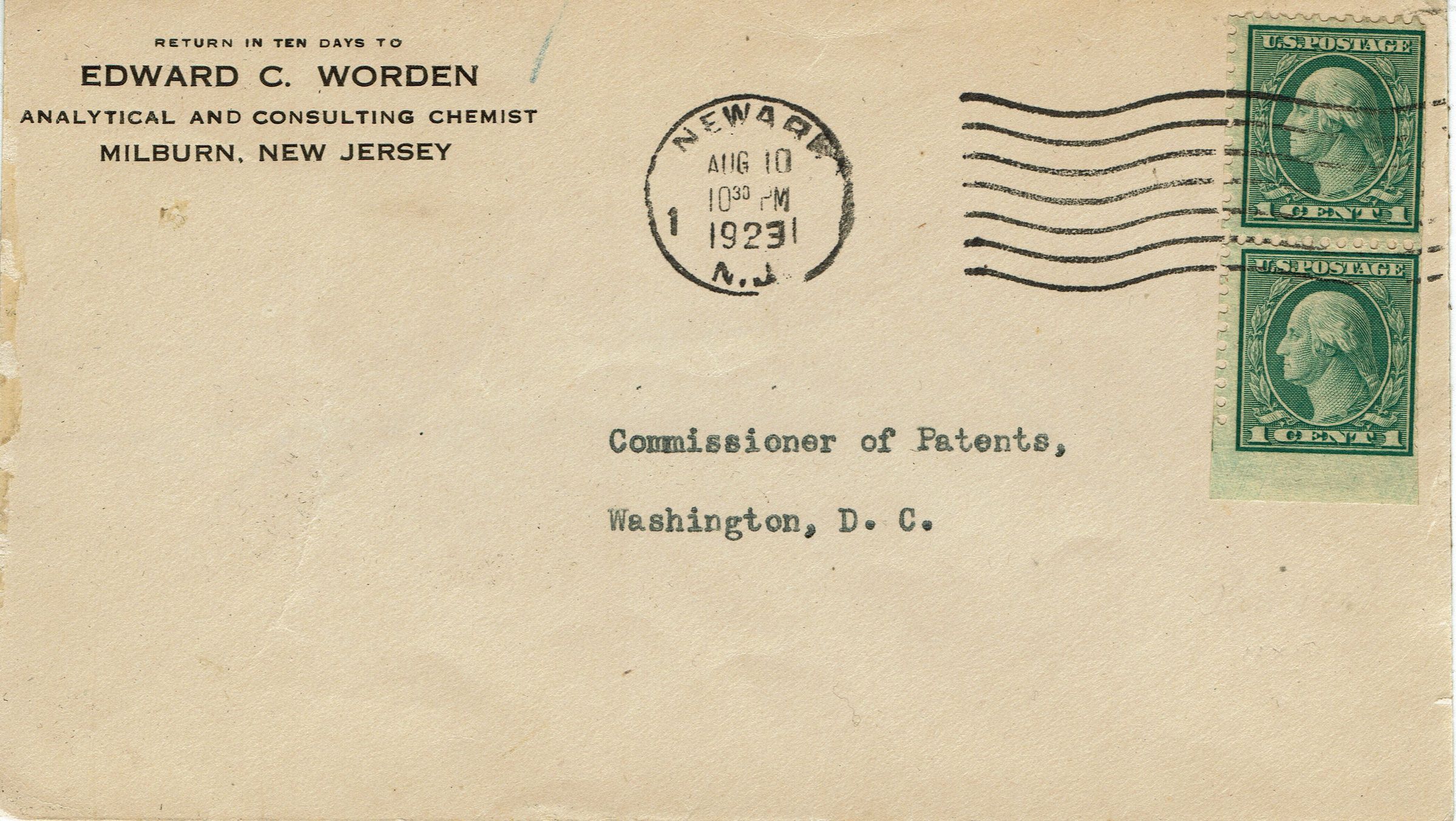 Envelope sent to the Commissioner of Patents, Washington, D.C. postmarked Newark, August 10, 1923 from Edward C. Worden, Analytical and Consulting Chemist, Millburn New Jersey. Edward Chauncey Worden was a renowned chemist, who held 8 patents, issued between 1931-1934, for his work on cellulose manufacturing. He became the head of Worden Laboratory, located at his house at 118 Sagamore norad, and went on to use his expertise to develop airplane wing coatings, which were used extensively by the US Military in WWI.Acquisition