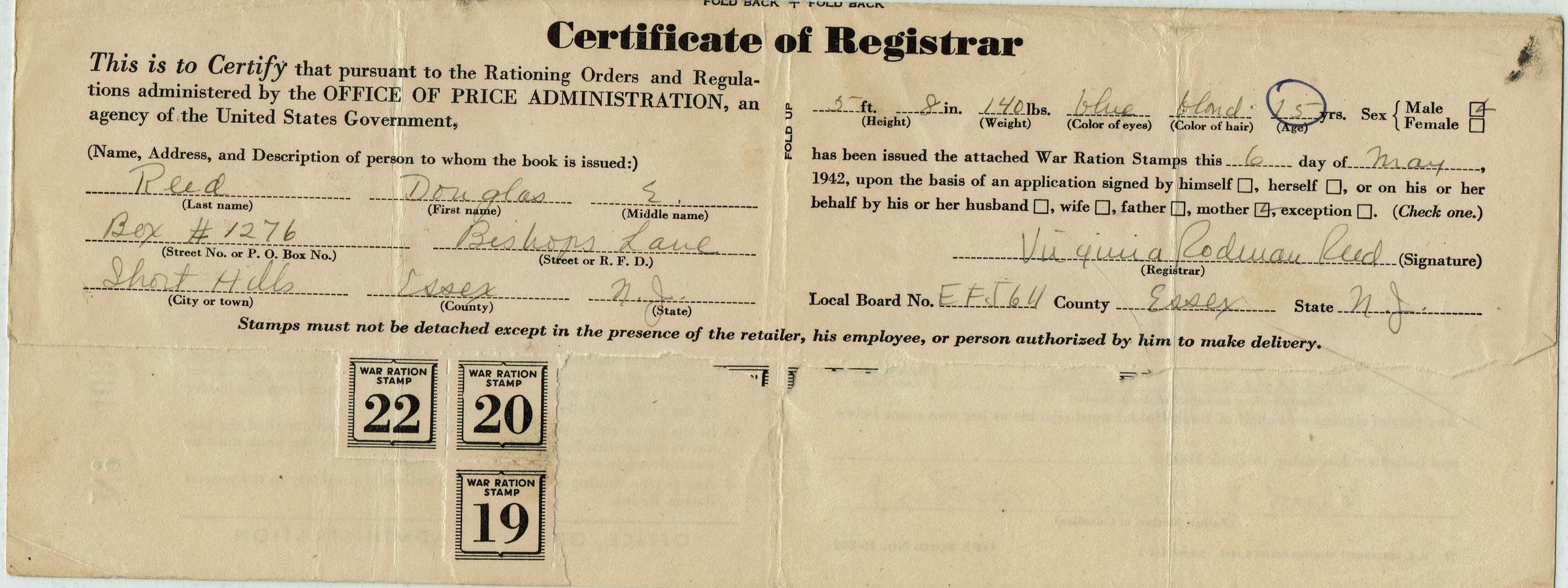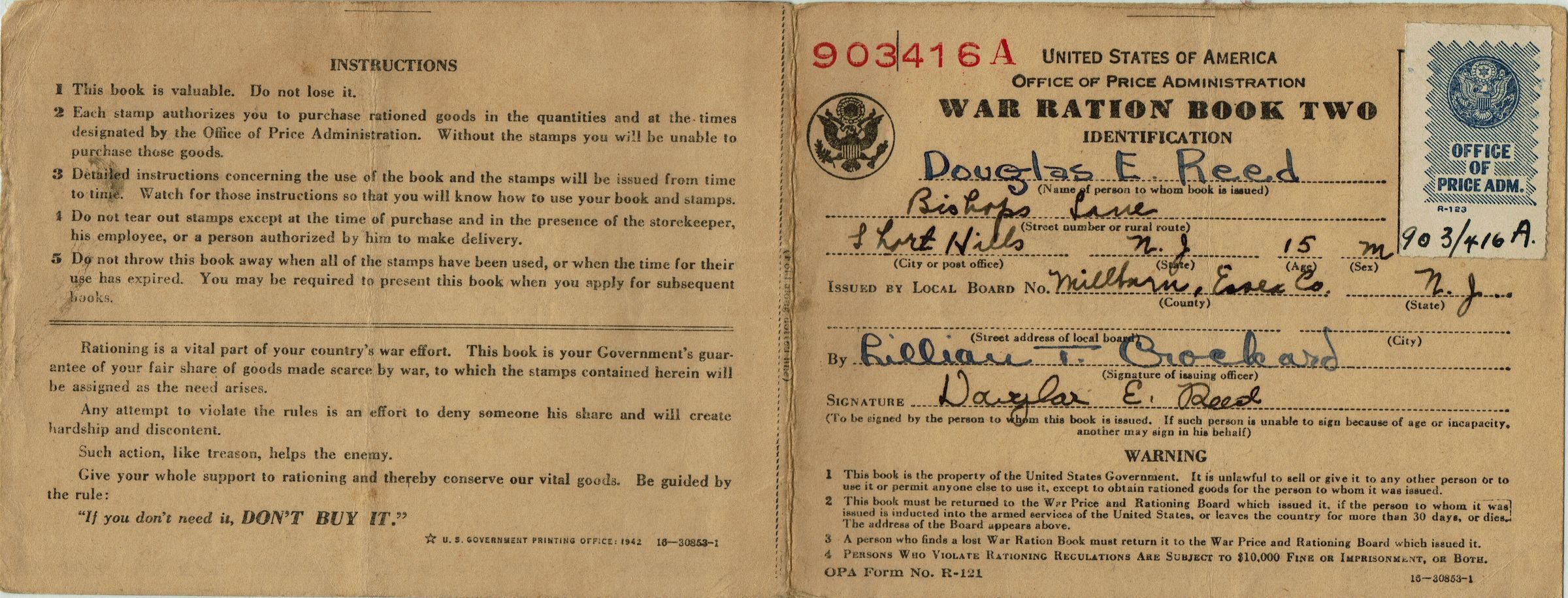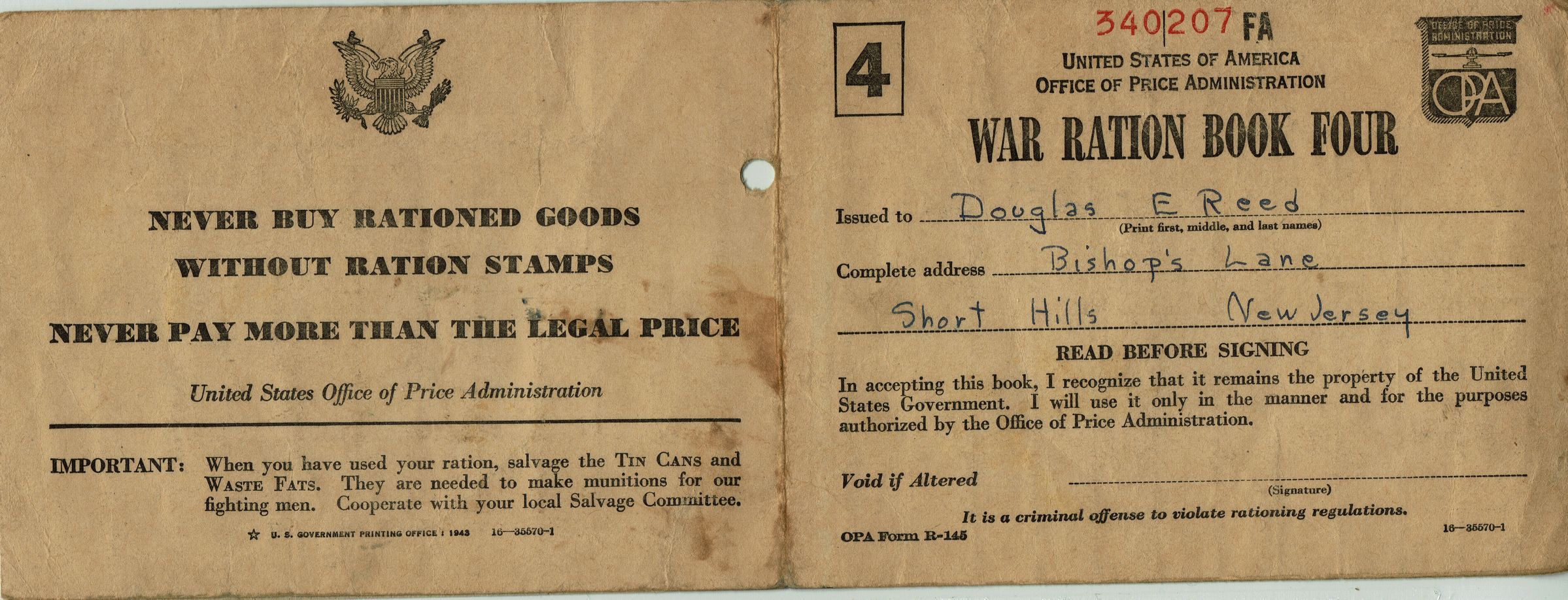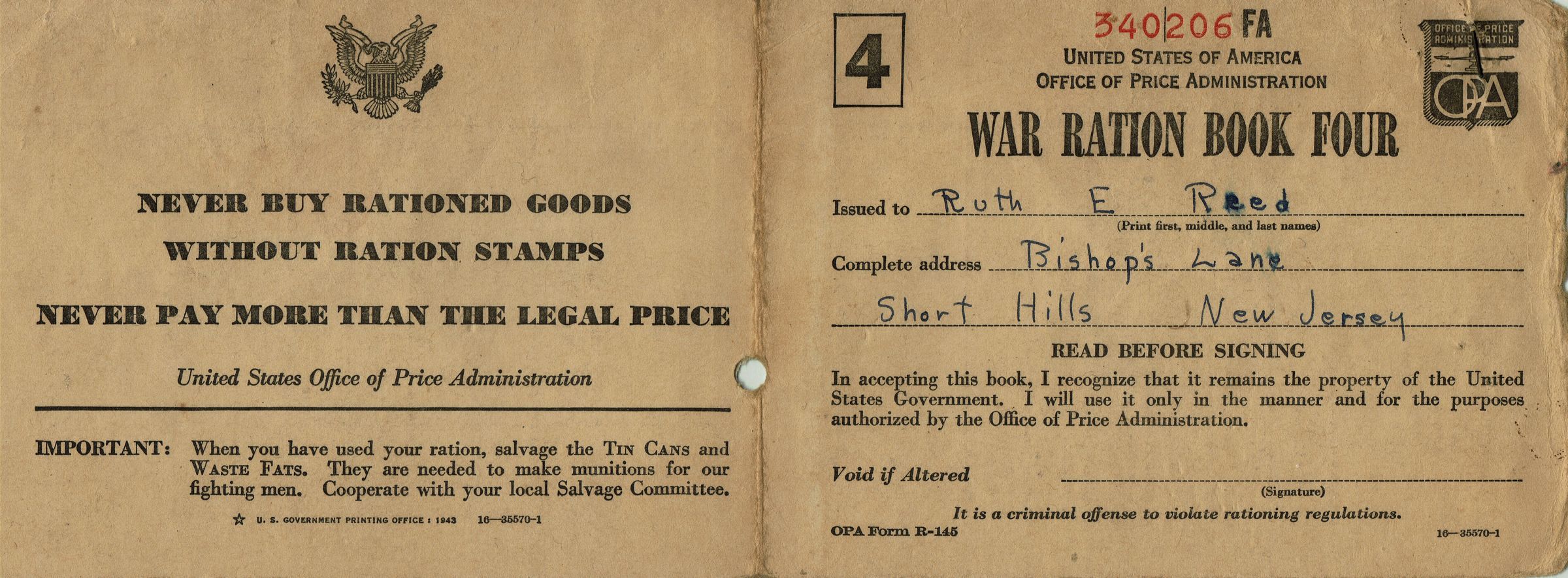 World War II Ration Books (4) with stamps issued to Douglas E. Reed and Ruth E. Reed, Bishops Lane, Short Hills, New Jersey.Acquisition