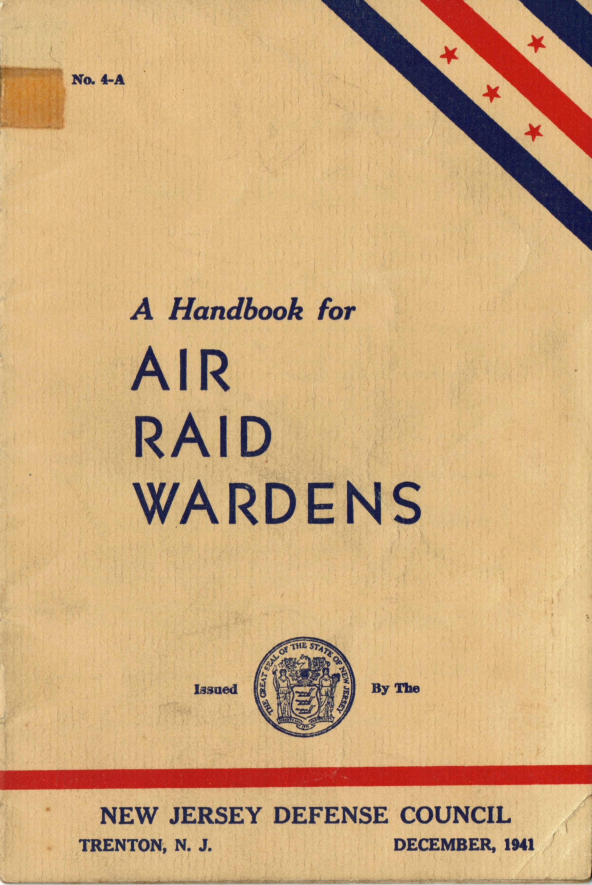 A Handbook for Air Raid Wardens Issued by the New Jersey Defense Council, Trenton, N.J., December 1941. 16 pp. Book explaining the duties of an Air Raid Warden, the organization, equipment, duties, training, report form and chart of symbols.Acquisition