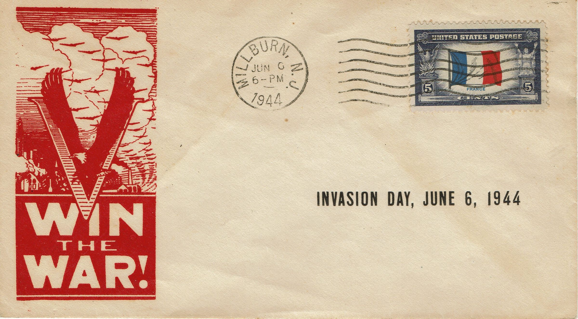 First Day Cover Envelope, Invasion Day, June 6, 1944 with "Win the War" cachet. Postmarked Millburn, N.J. June 6, 1944, 6:00 pm.Acquisition