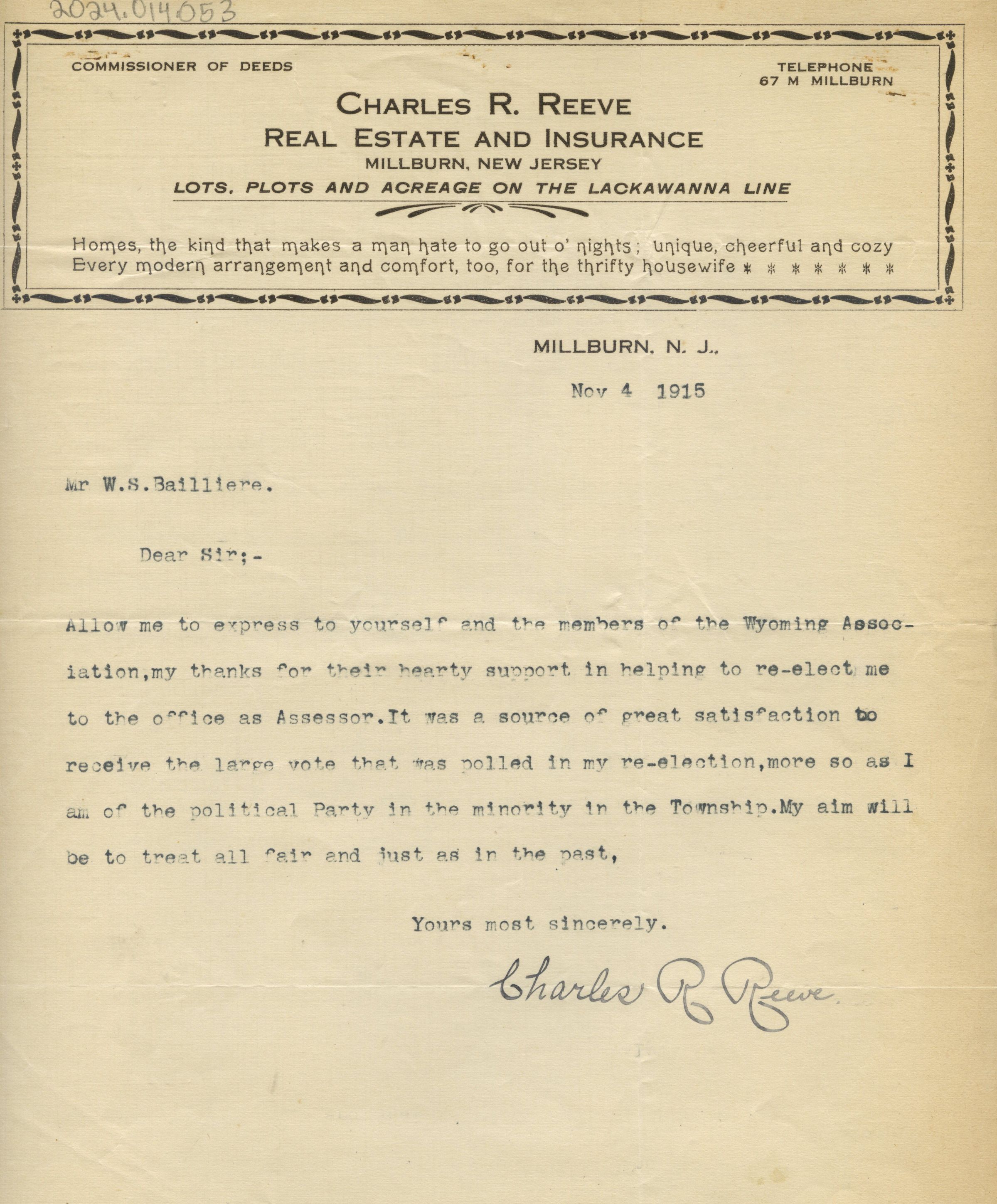 Letter written on November 4, 1915 by Charles R. Reeve on letterhead expressing his thanks to the members of the Wyoming Association for re-electing him to the office as Assessor. Charles R. Reeve was the Millburn Township Commissioner of DeedsCollection