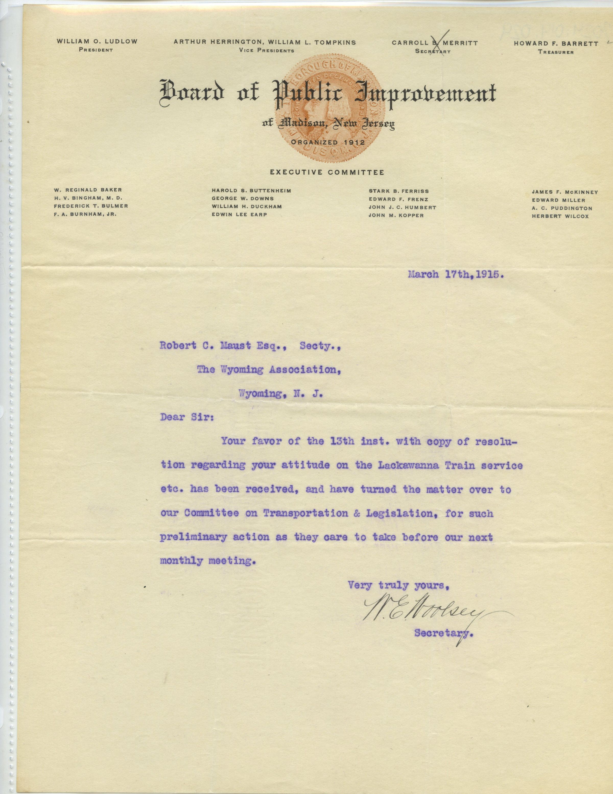 Letter dated March 17, 1915 on stationery from the Board of Public Improvement of Madison New Jersey Carroll B. Merritt writes to Robert C. Maust about his favor of the 13th inst. with copy of his resolution regarding his attitude on Lackawanna Train Service being resolved.Collection