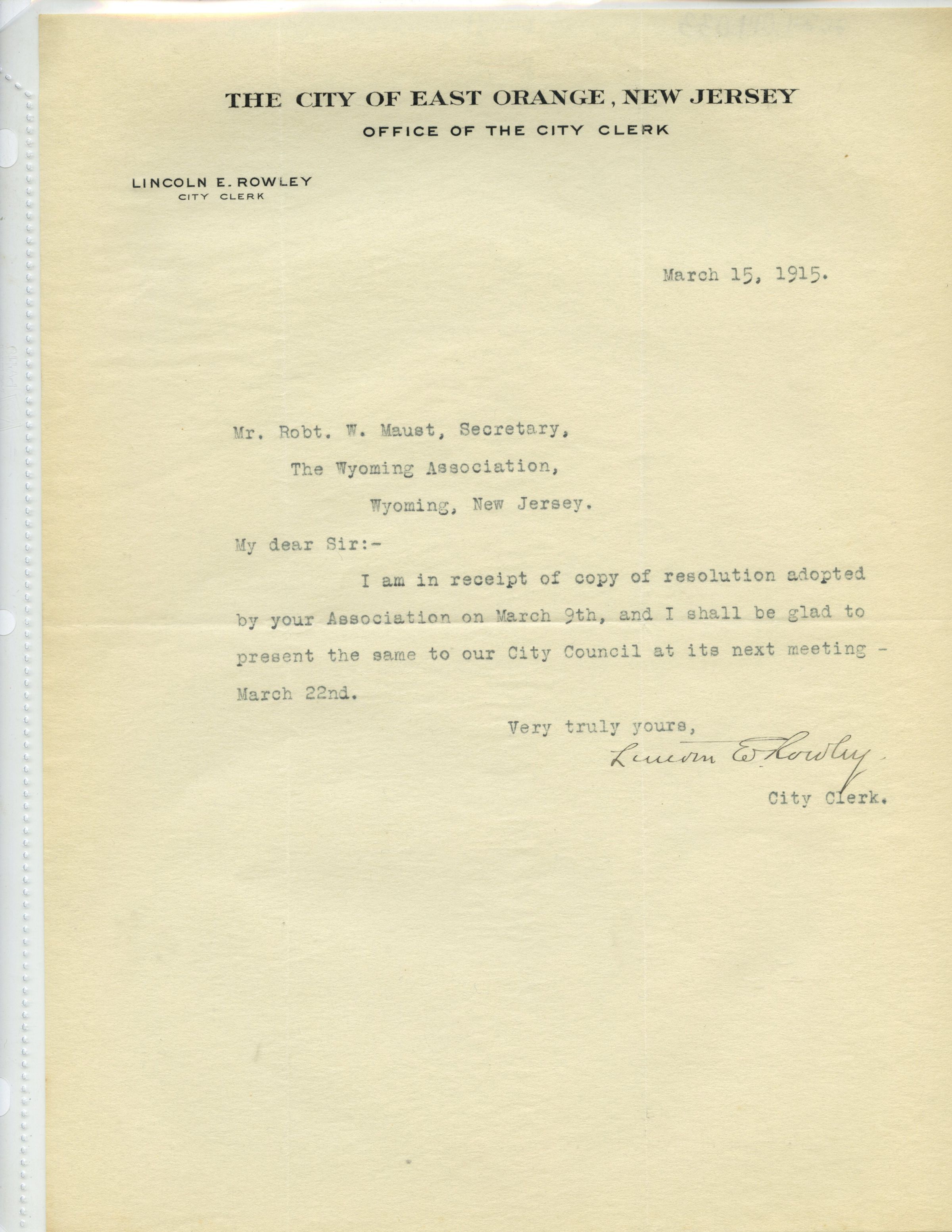 Lincoln E. Rowley (City Clerk) writes to Robert W. Maust agreeing to present his resolution to the City Council at their next meeting on March 22nd.Acquisition
