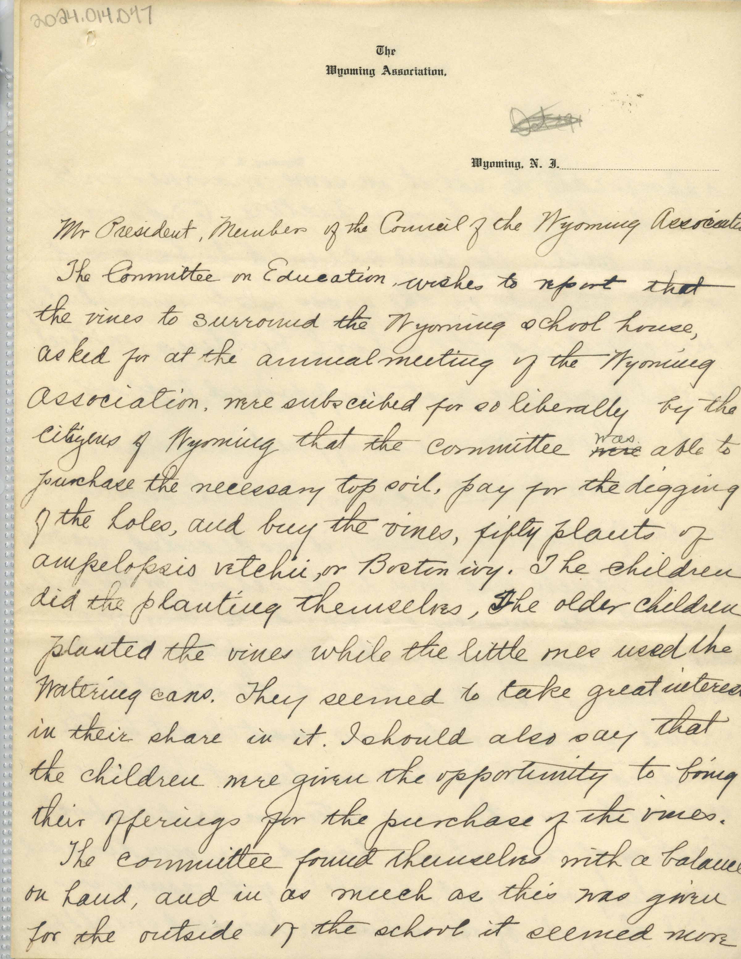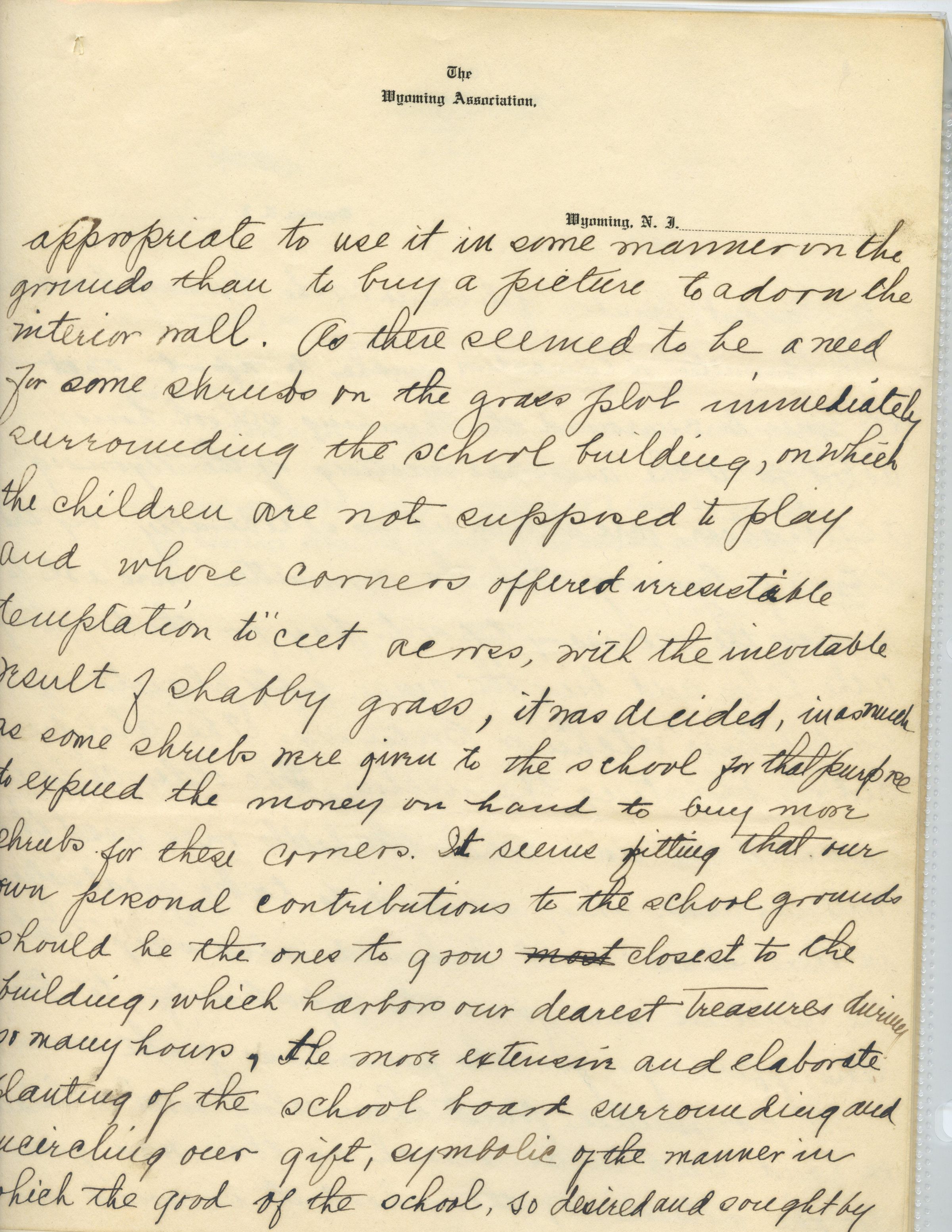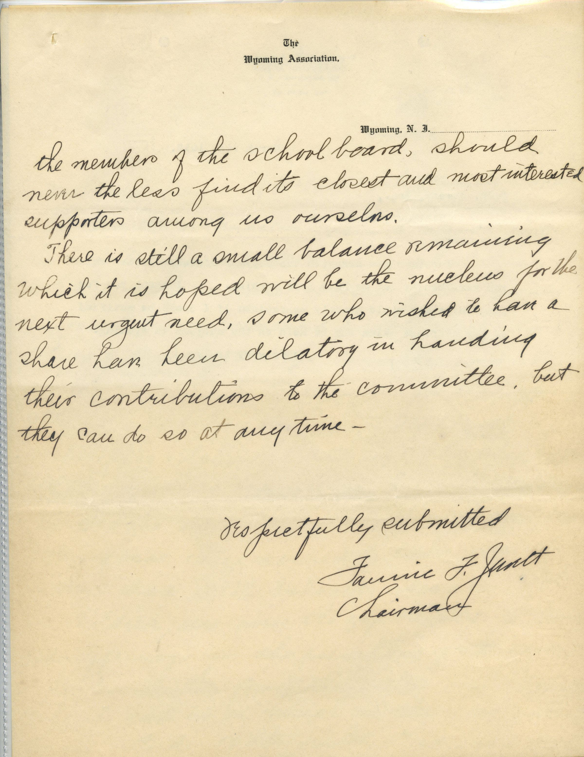 Wyoming Civic Association: Letter outlining plans to buy more land for Millburn Township Schools, 1912Entry/Object ID