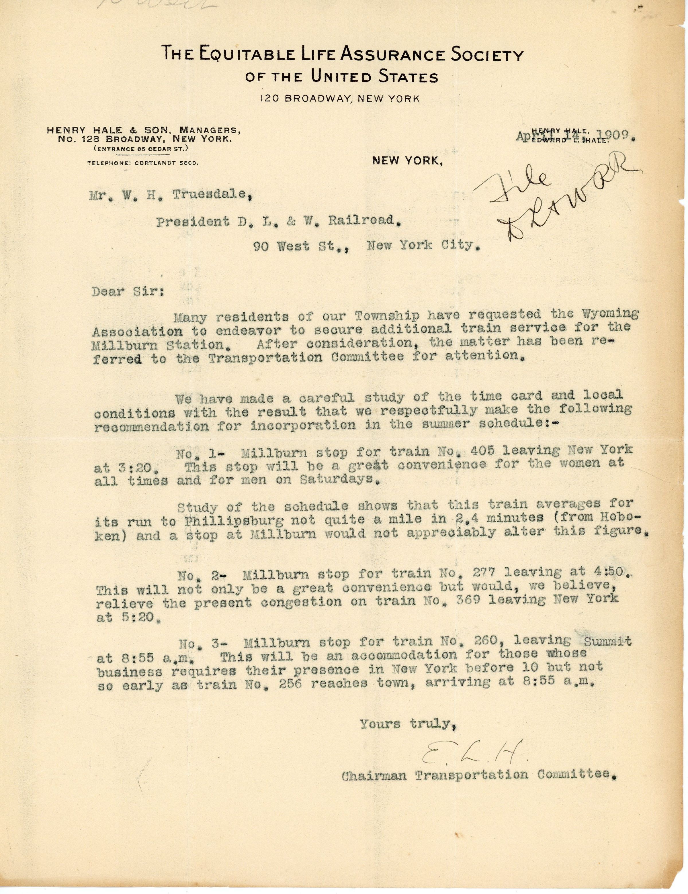 Wyoming Civic Association: Letter to D.L.& W. About Additional Train Services, 1909