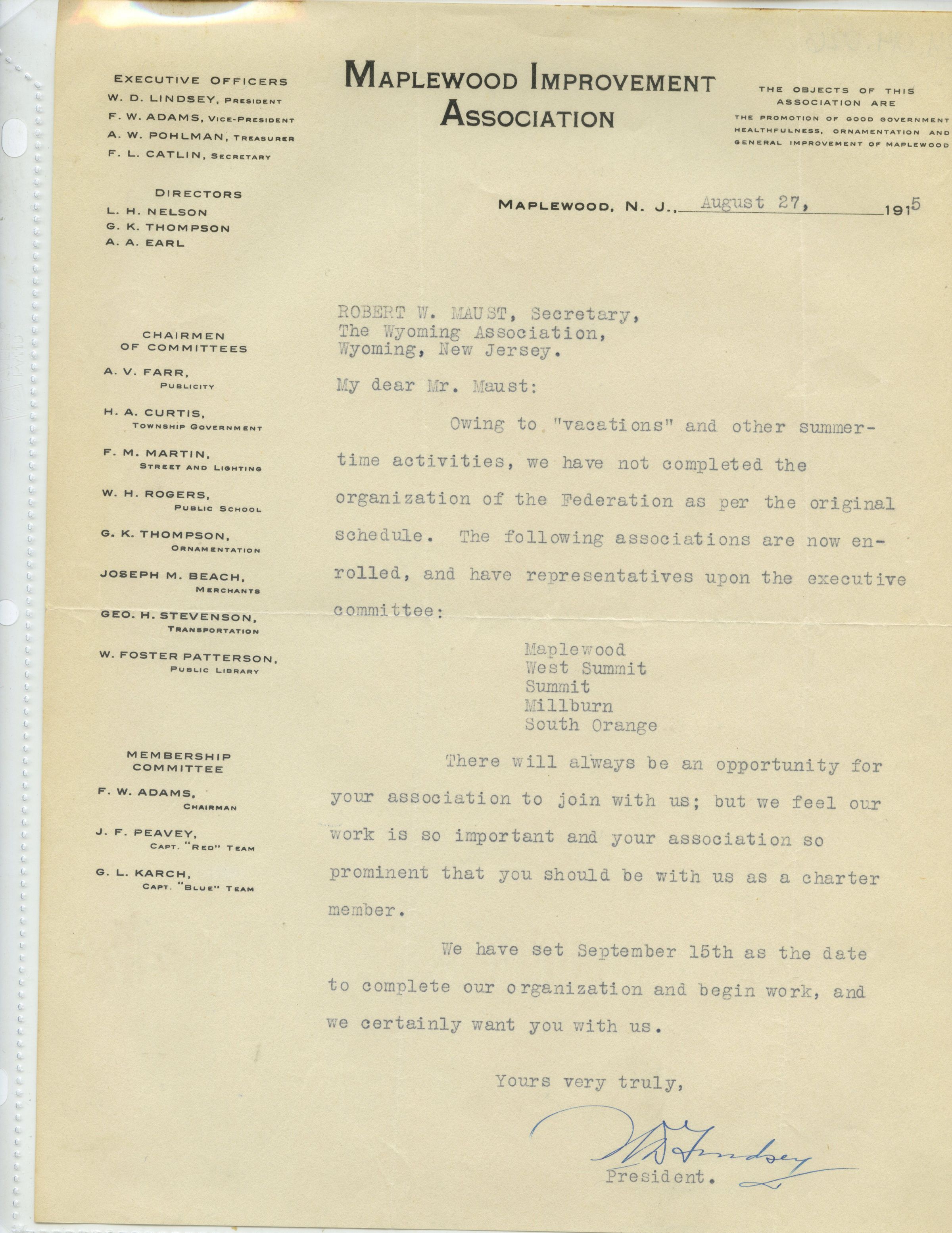 W.D. Lindsey, president of the Maplewood Improvement Association, wrote to Robert W. Maust, secretary of the Wyoming Civic Association, to request them to join a charter for an organization.Acquisition