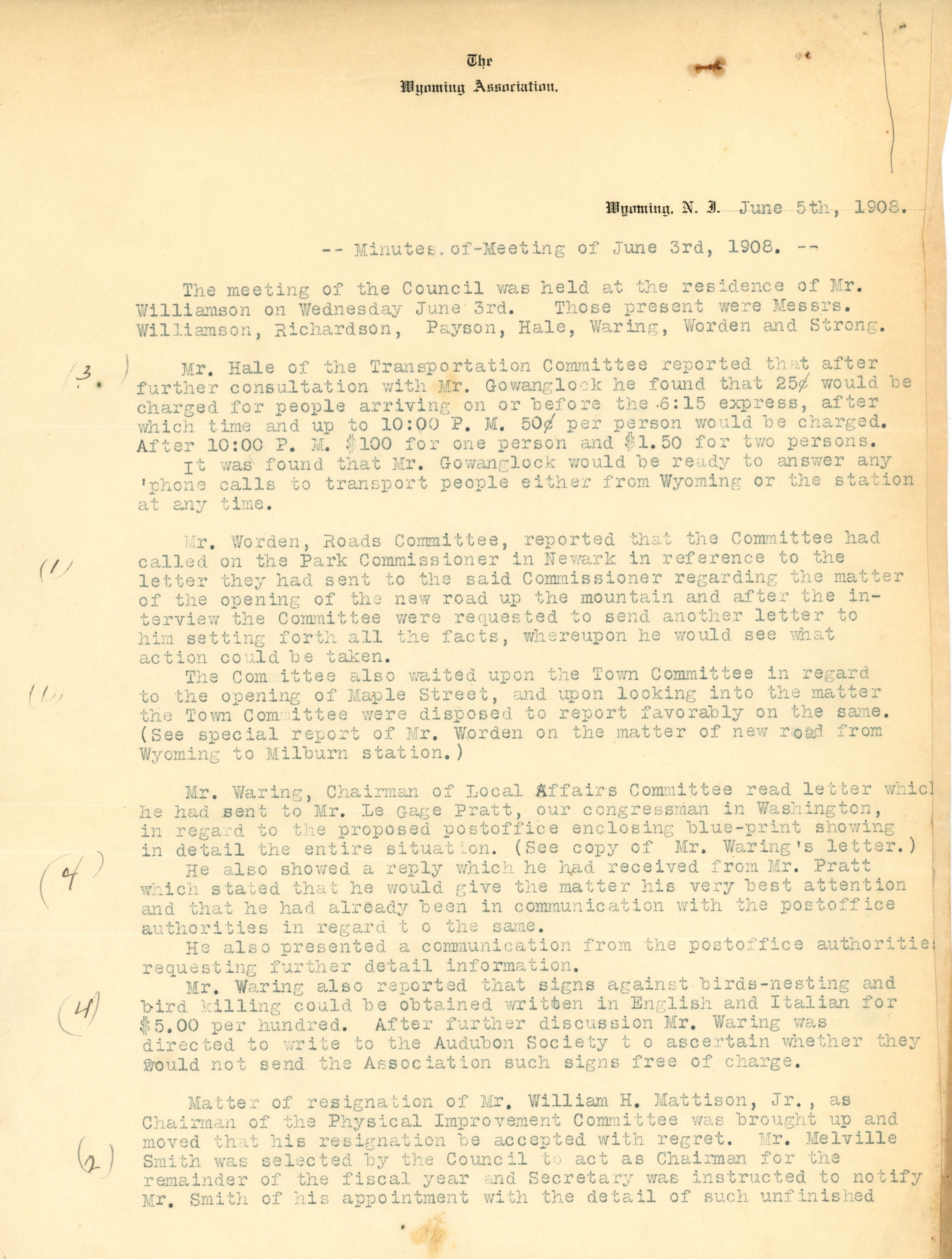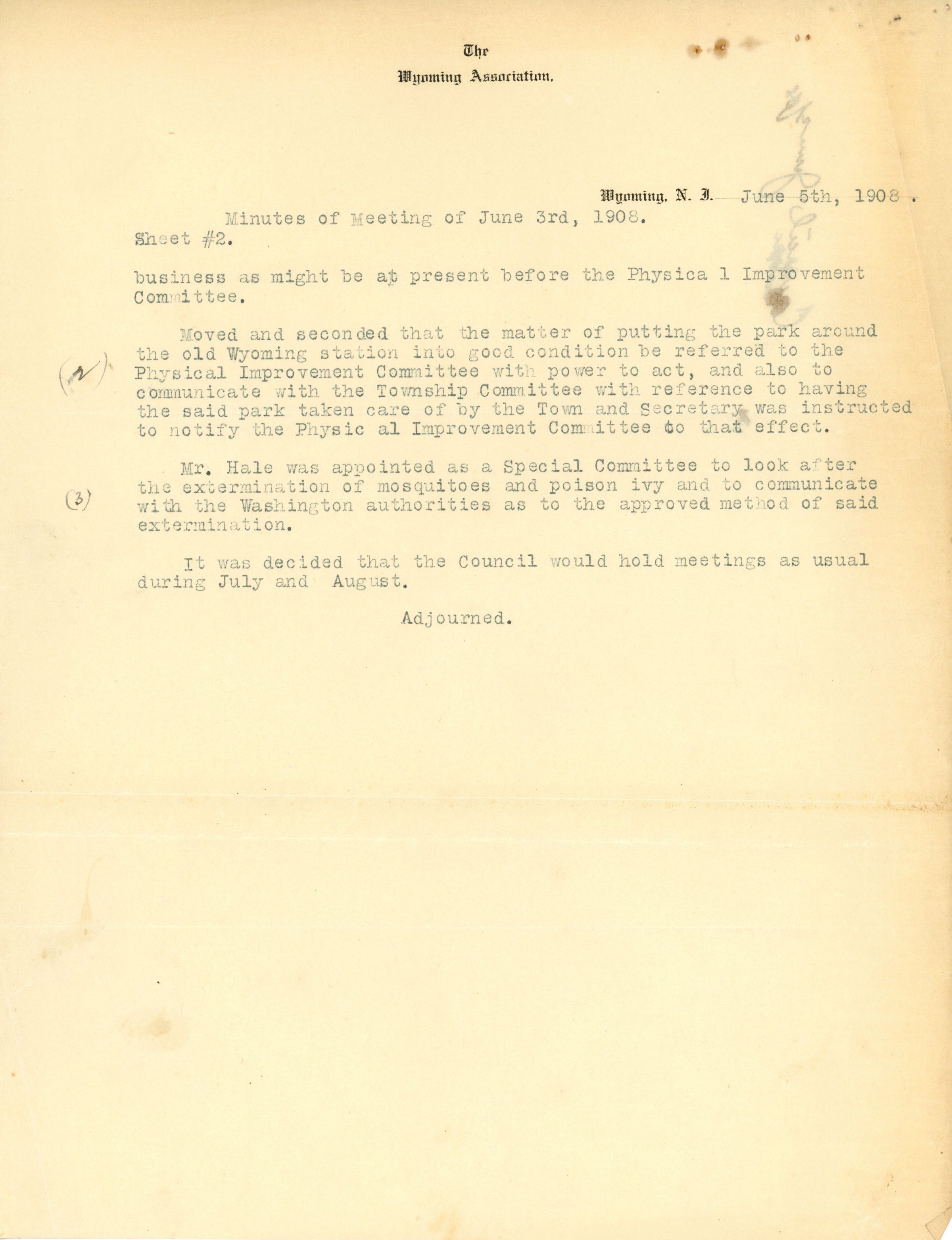 Two page typed minutes from the June 3, 1908 Wyoming Association Meeting. Minutes pinned into the Wyoming Civic Association (1907-1910) book.Collection