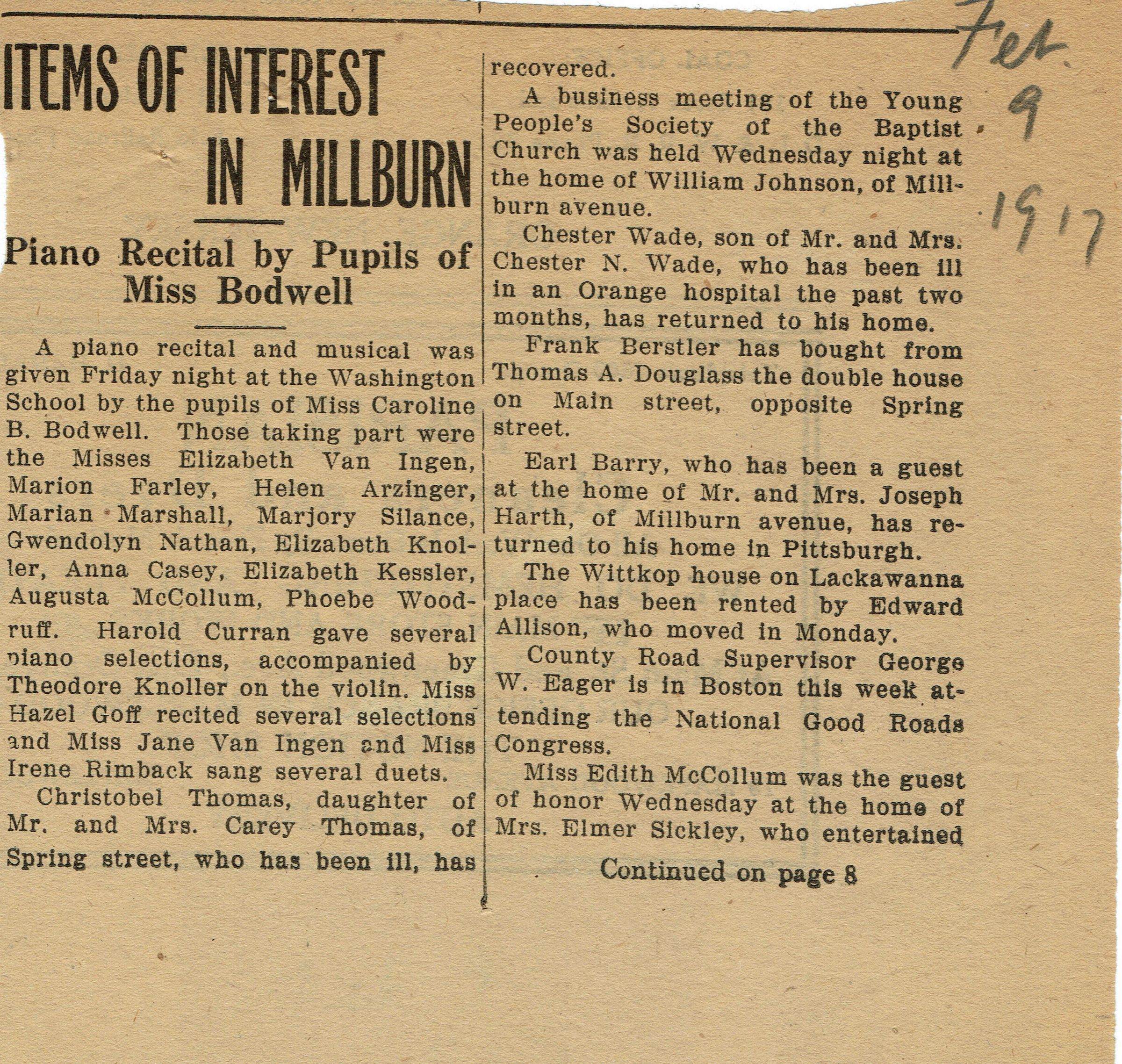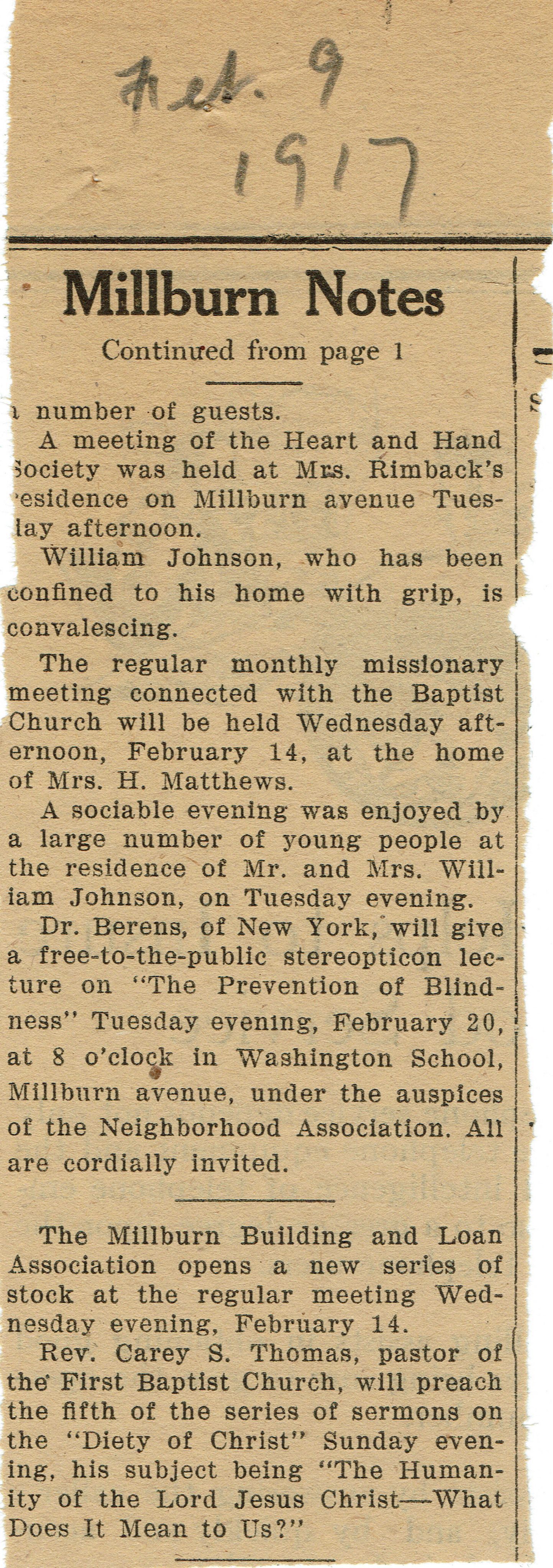 Wyoming Civic Association: Millburn Notes: Bodwell, Rimback, Baptist Church, 1917