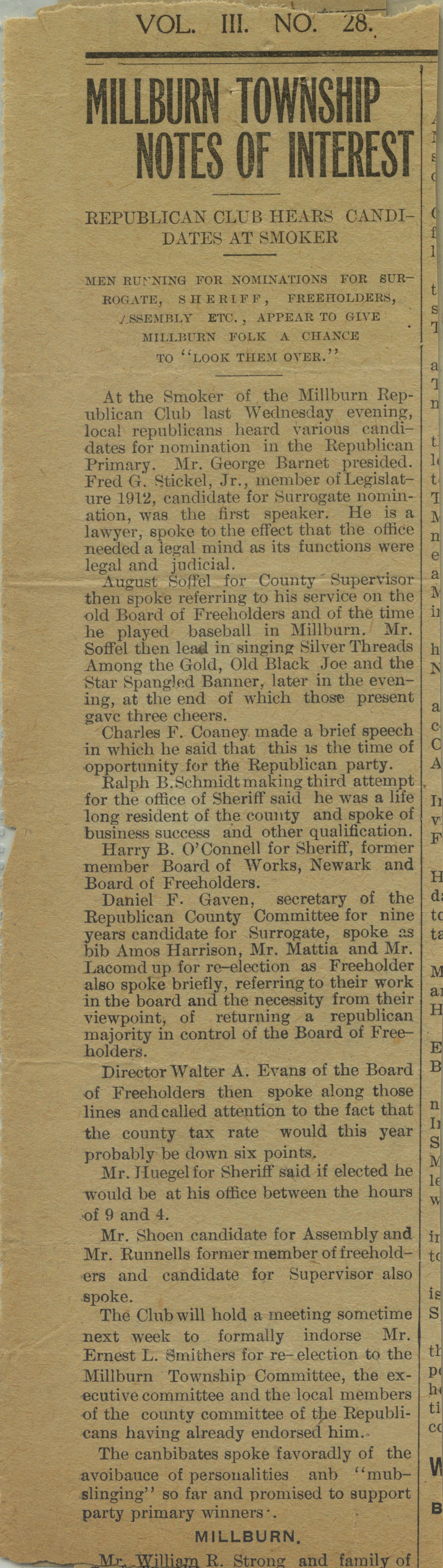 October 1914 article about men running for nominations for surrogate, sheriff, freeholders, assembly, etc. speaking at the Millburn Republican Club.