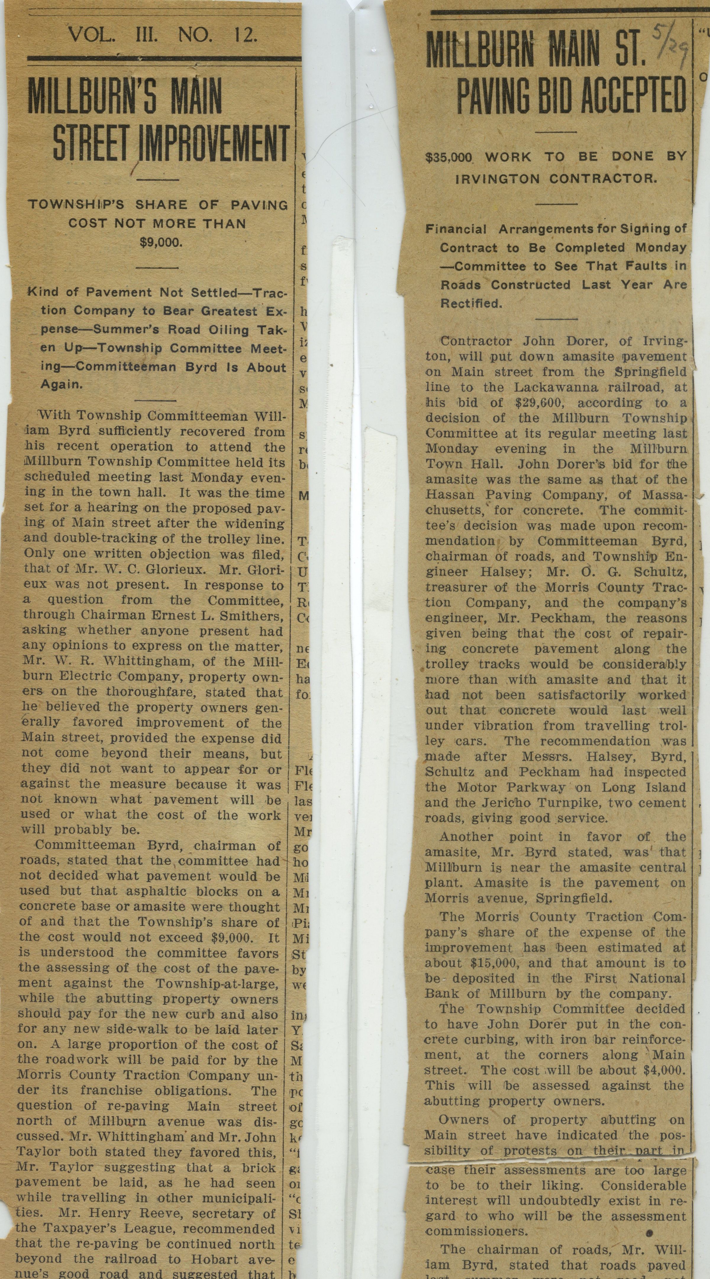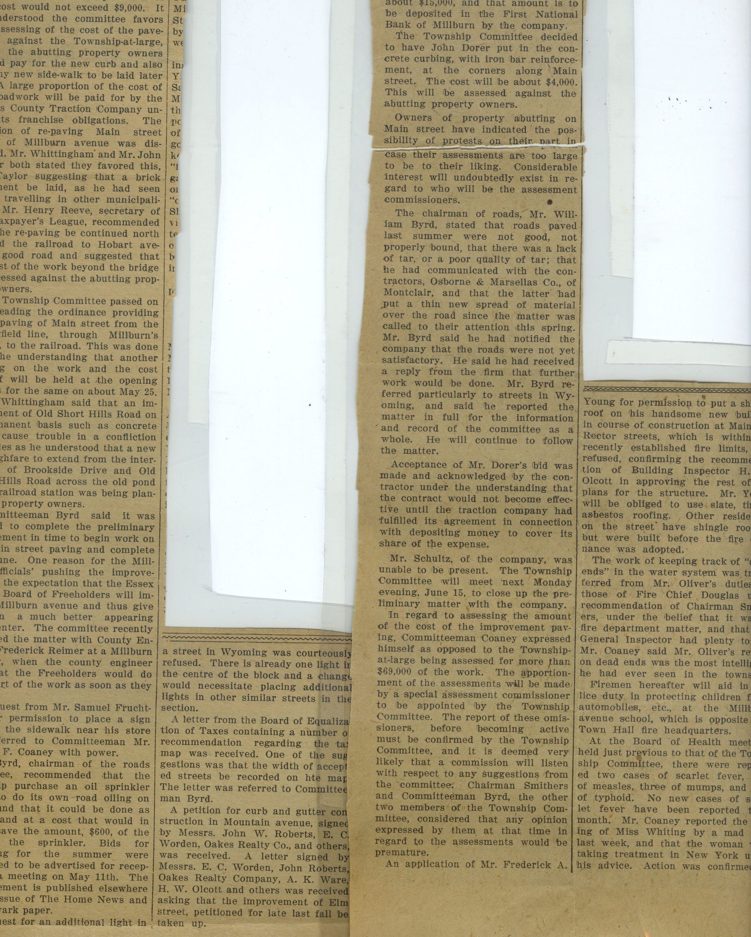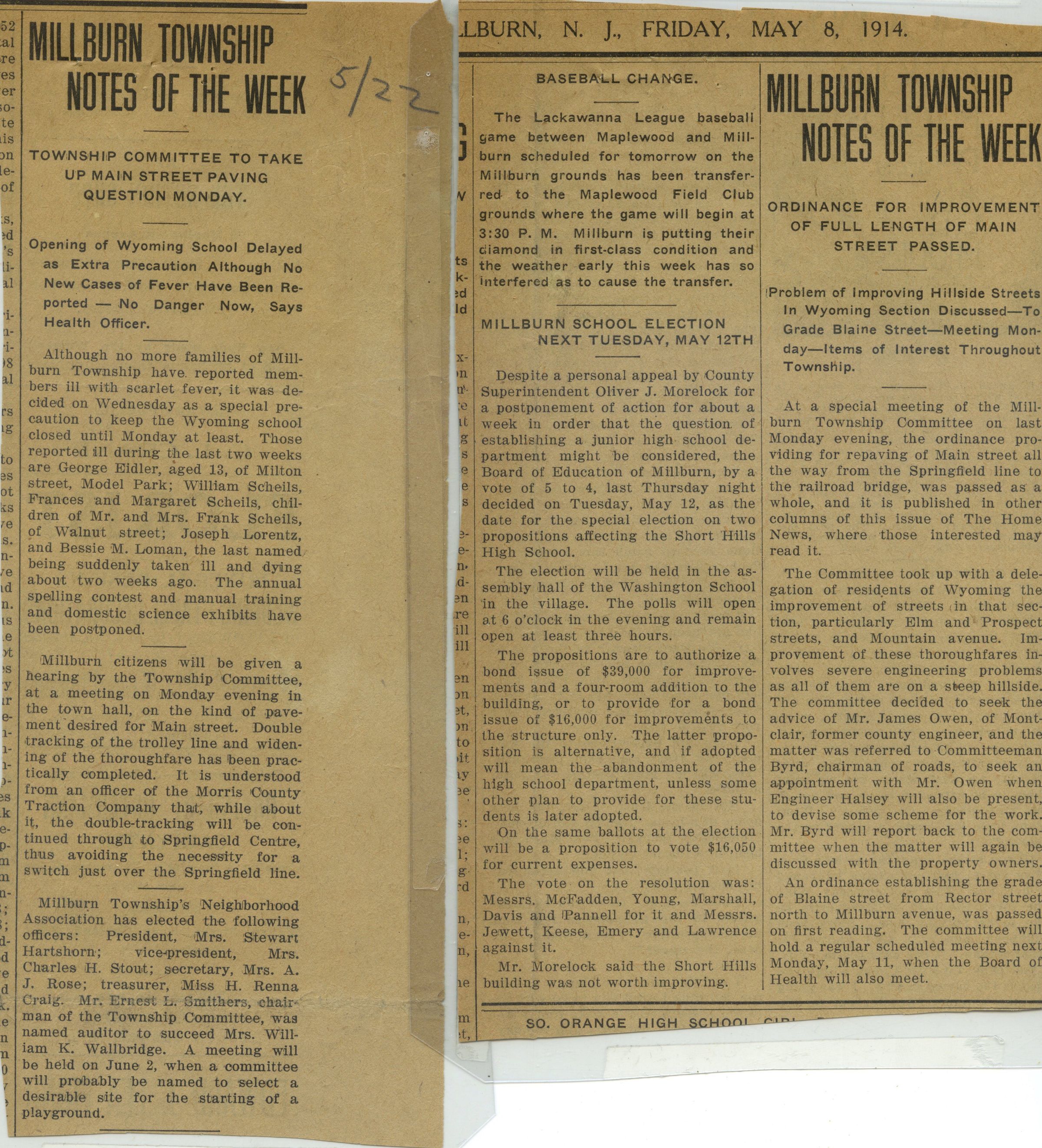 Details the choice to delay opening of Wyoming School due to the scarlet fever, the meeting for citizens to decide the type of pavement desired for Main Street, and the elected members of Millburn Township's Neighborhood Association: