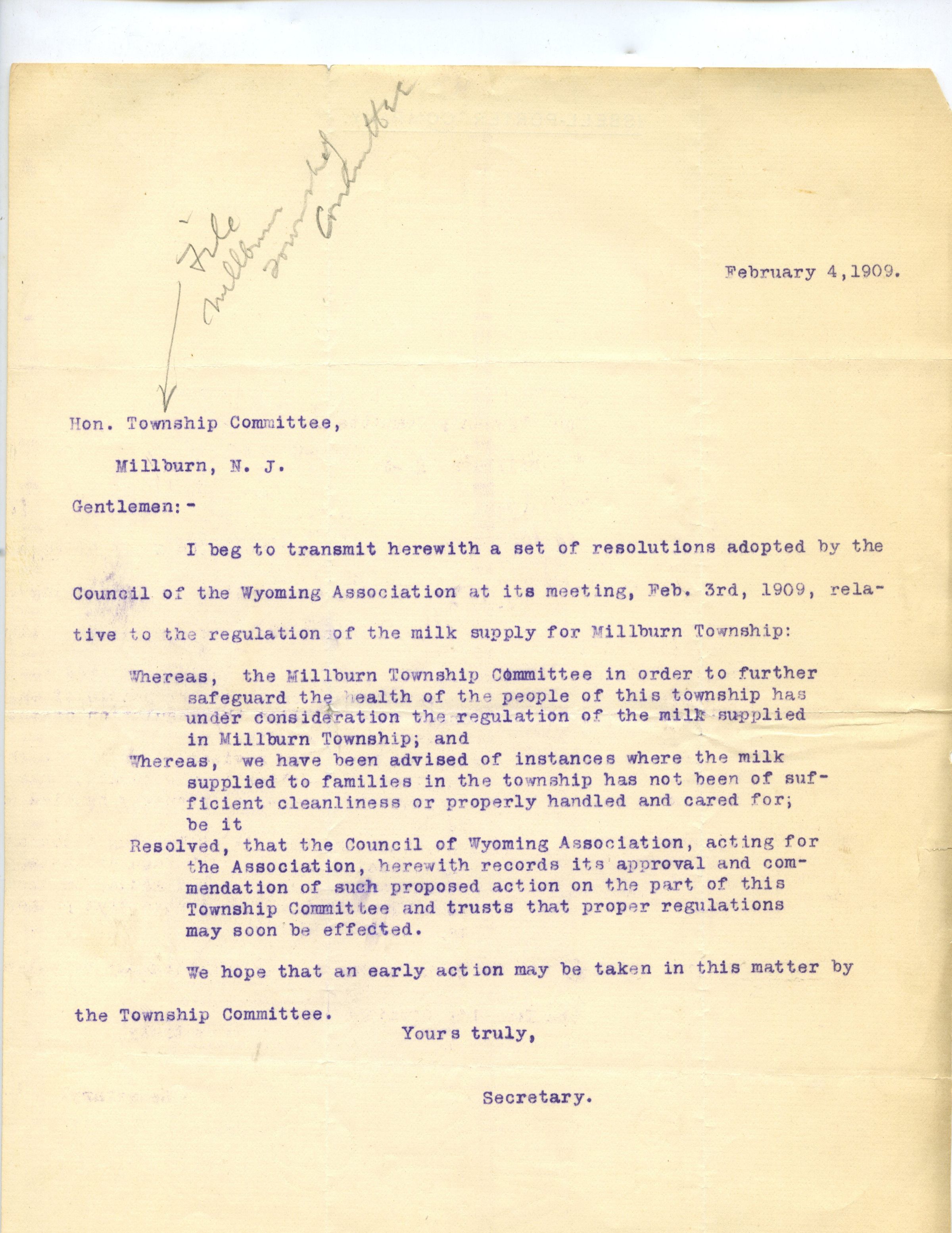 Typewritten letter from the Secretary of the Wyoming Civic Association to the Millburn Township Committee dated February 4, 1909 expressing the concern over regulations of the town's milk supply and requests the Committee to implement new regulations to ensure improved hygienic conditions.Collection