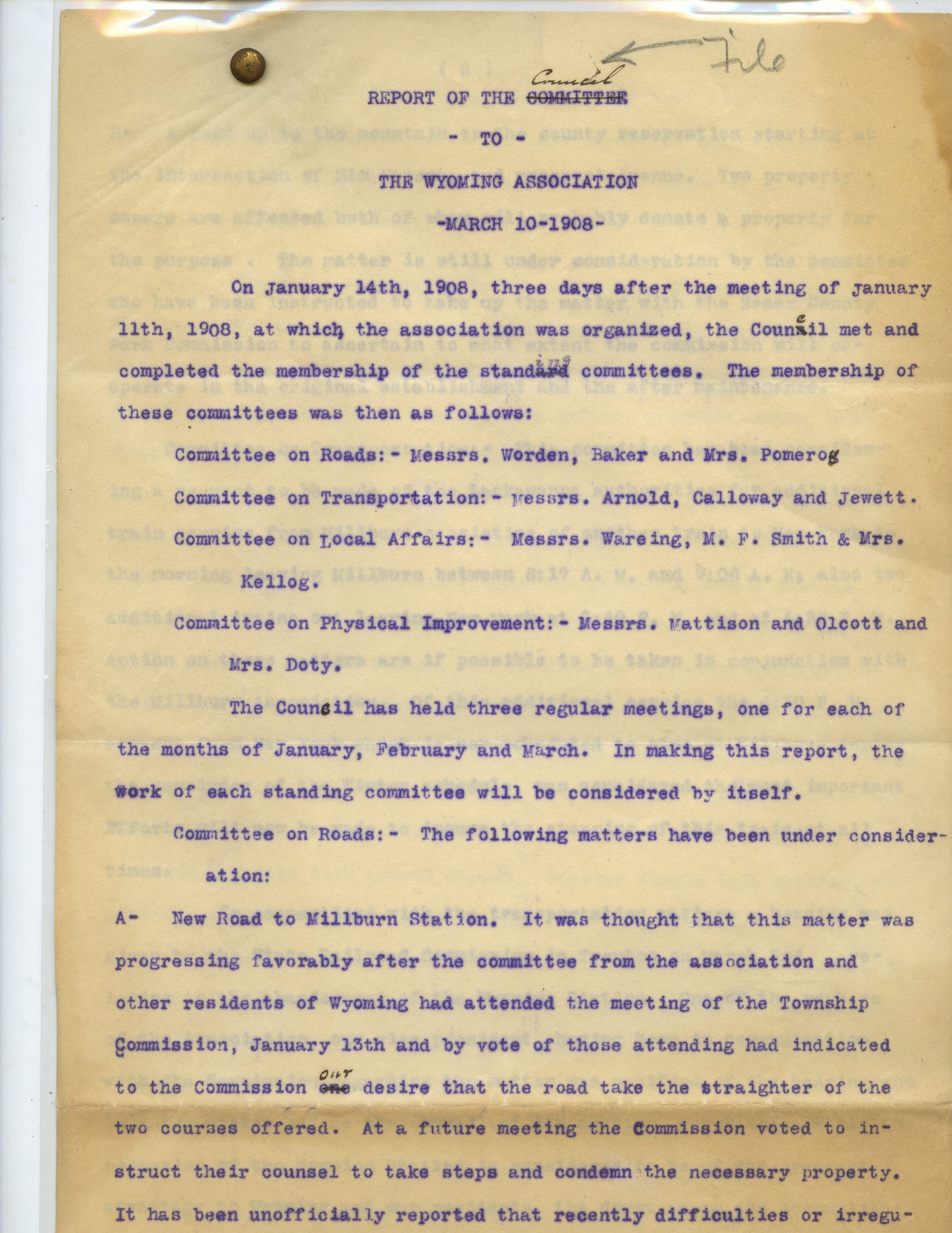Typewritten report from the Wyoming Civic Association dated March 10, 1908 detailing the new committee heads and their points of action.