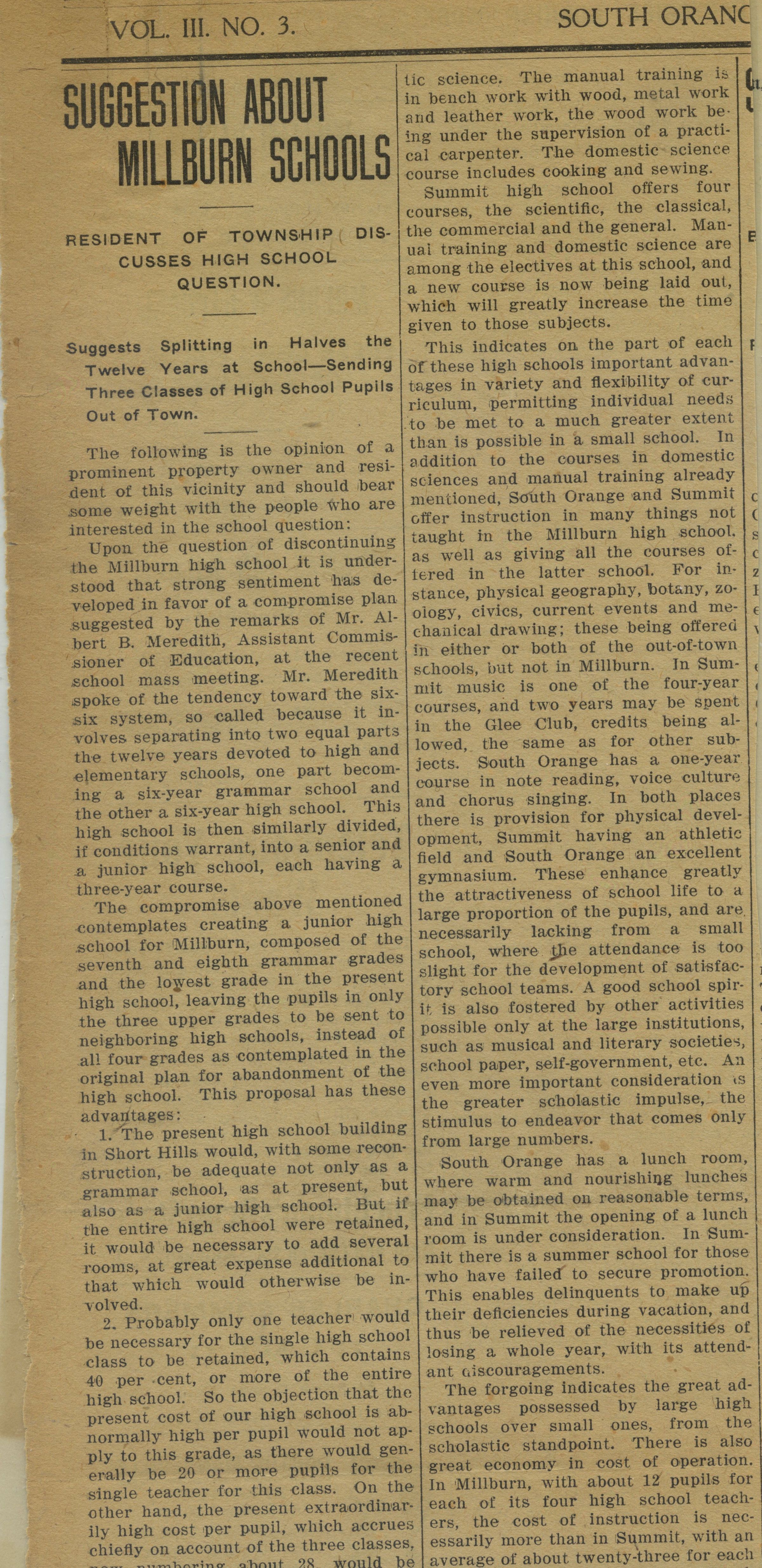Proposal suggested by Mr. Albert B. Meredith, Assistant Commissioner of Education to split the twelve years devoted to elementary and high school into two six year schools. A grammar school for the first 6 years, and the high school would be further split into a junior and senior high school.