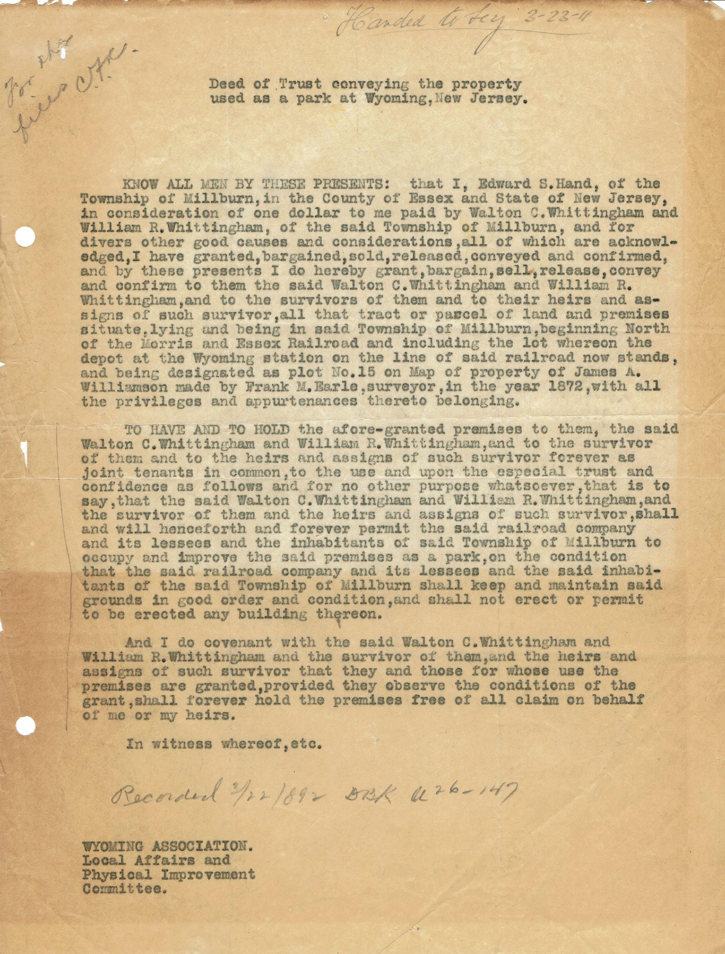 Deed of Trust Conveying the Property Used as a Park at Wyoming, New Jersey from the Wyoming Association. The deed was made with Walton C. Whittingham and William R. Whittingham by Edward S. Hand.Acquisition