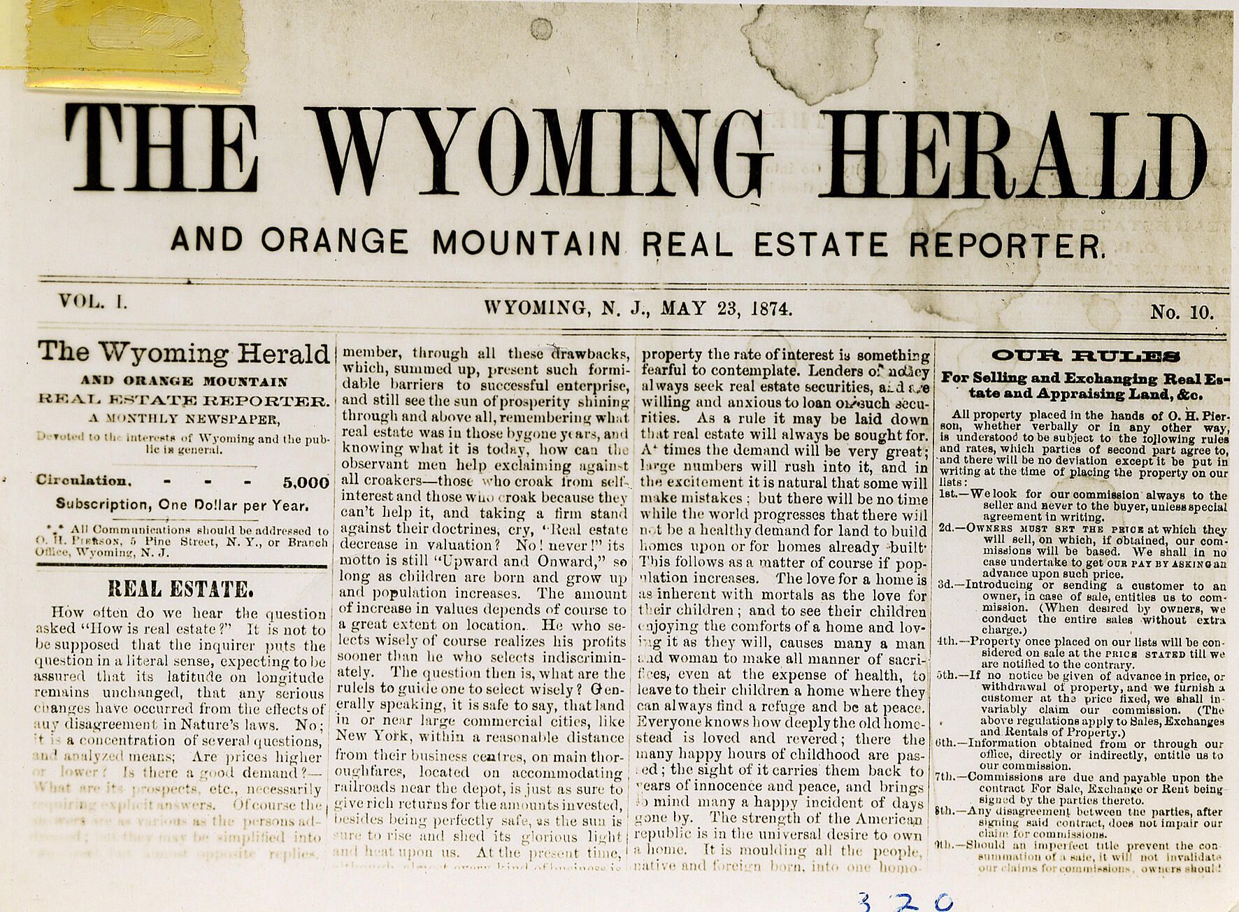 Photograph of the Masthead of the Wyoming Herald and Orange Mountain Real Estate Reporter, May 23, 1874.