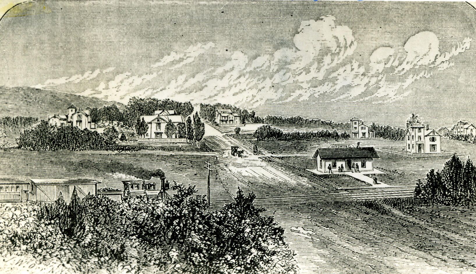 Looking up Wyoming Avenue, from" Pen and Pencil Pictures On The Delaware, Lackawanna, and Western Railroad," p. 76. In 1874, J.K. Hoyt of Madison, NJ published " Pen and Pencil Pictures On The Delaware, Lackawanna, and Western Railroad." The book was a result of a trip he made along the line, stopping to spend some time at each town along the way. In it, he includes a pen and pencil picture of each town, along with its past history, current developments, and his thoughts as to the future. Hoyt includes Wyoming, Millburn and Short Hills in his account. There are engravings Wyoming Area and Short Hills.Dimensions