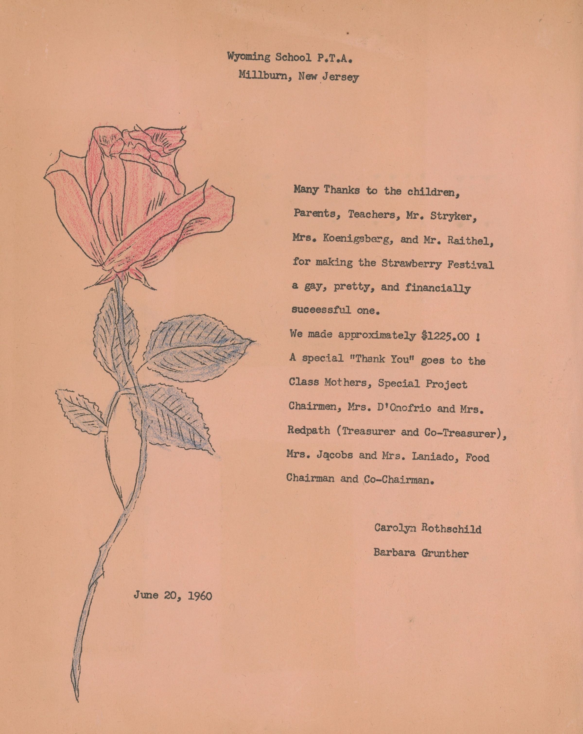 Thank you note date June 20, 1960, from the Wyoming School PTA Presidents Carolyn Rothschild and Barbara Grunther for a successful Strawberry Festival.Acquisition