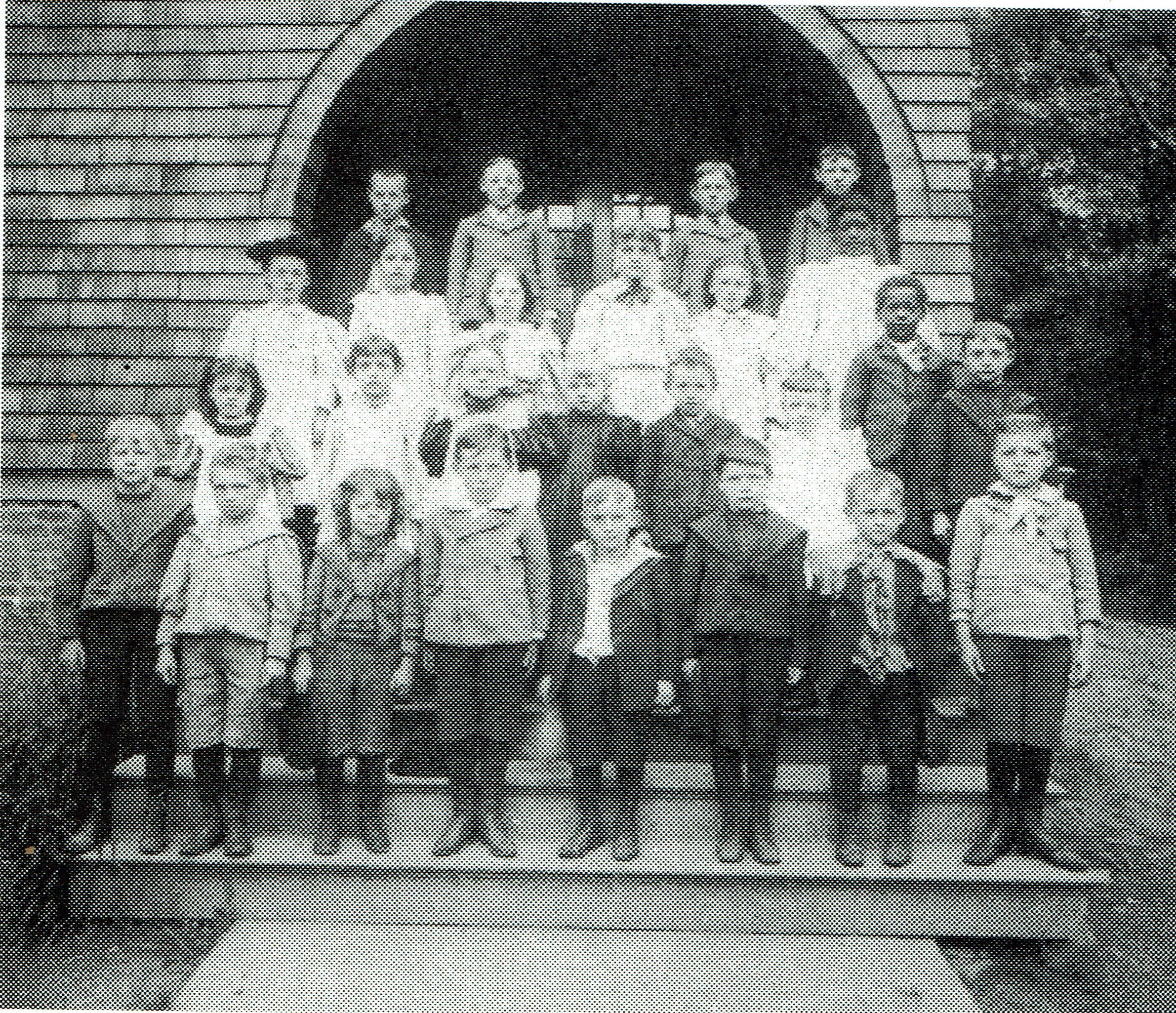Photograph of students standing outside the original Wyoming School Building (1894-1910). Photograph comes from the cover of the 2000-2001 Wyoming School Directory.