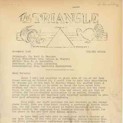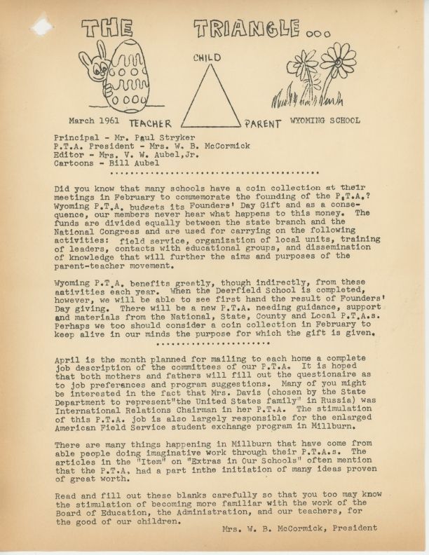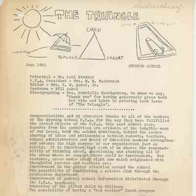 Wyoming School Newsletters "The Triangle." March, April and November 1961. From the 1961 Wyoming School PTA Scrapbook.Acquisition