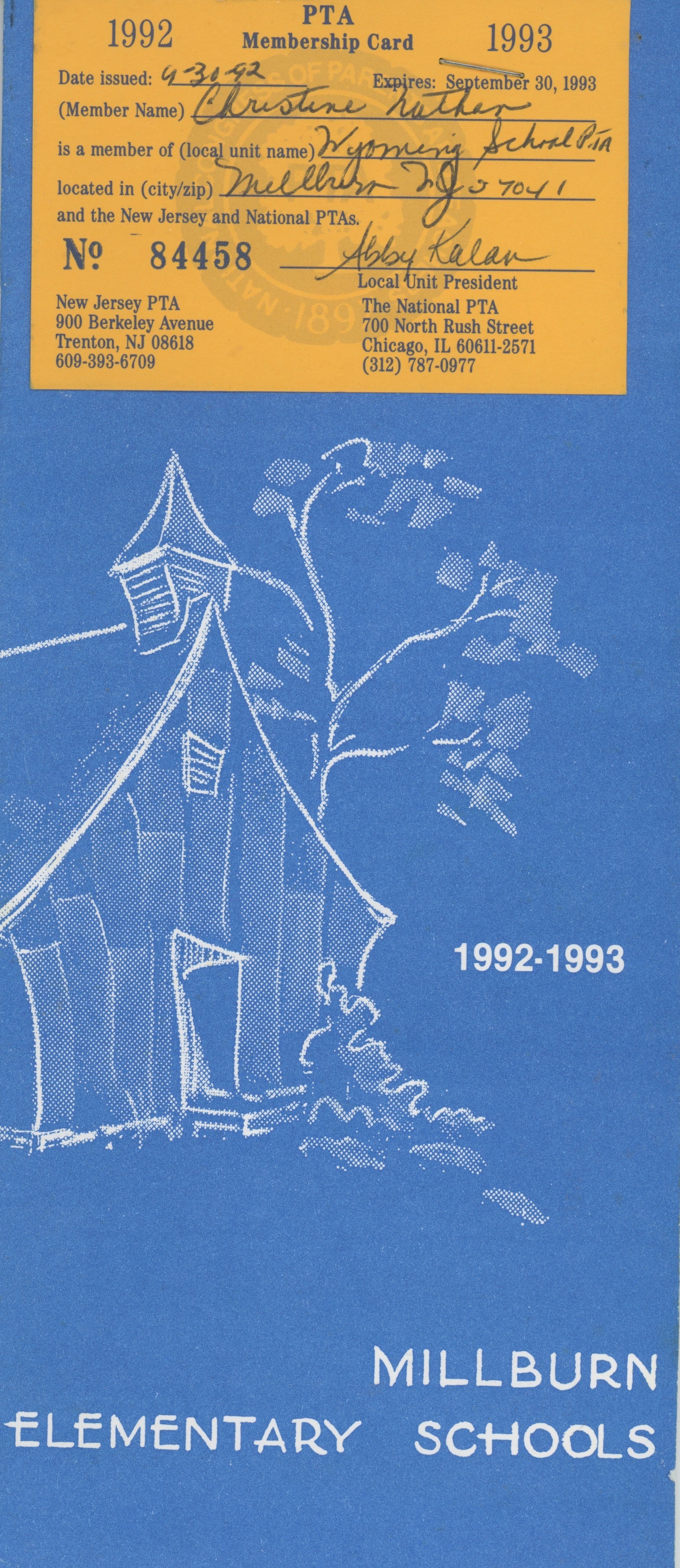 Handbook presented by the PTAs of all the Millburn Elementary Schools containing information about the day-to-day operation of the schools. 13 pp. The booklet contains both general district information (white pages) and information specific to each of the schools (blue pages). During the 1992-1993 academic year, the Wyoming Elementary School Principal was Martin J. Burne and PTA President was Abby Kalan. The booklet contains the PTA Membership Card of Vice President and BOE liaison Christine Nathan stapled to the front cover. Class distribution was as follows: 3 classes in Kindergarten, First, Second and Third Grades, 2 classes in Fourth and Fifth Grades.