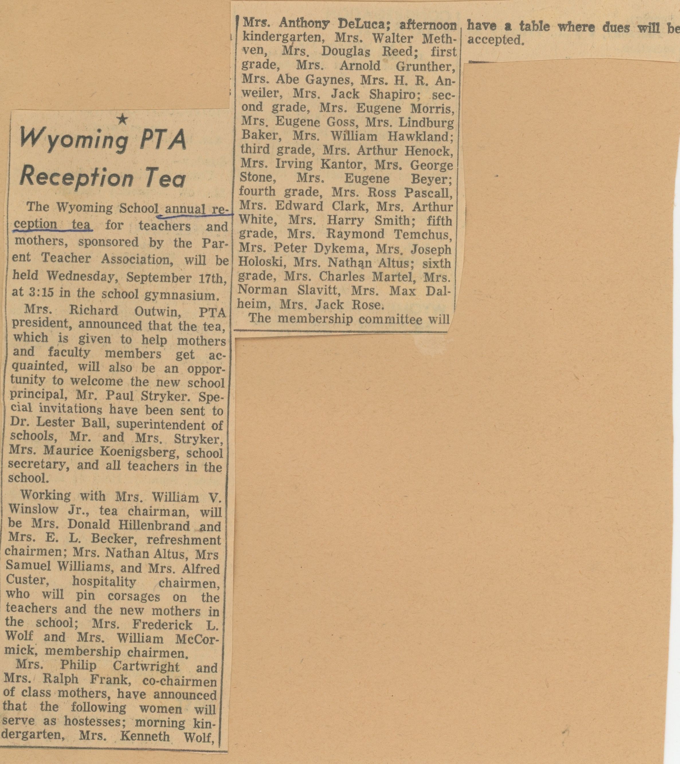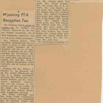 Flyer and newspaper article about the annual Wyoming PTA Reception Tea for new families on September 17, 1958.Acquisition