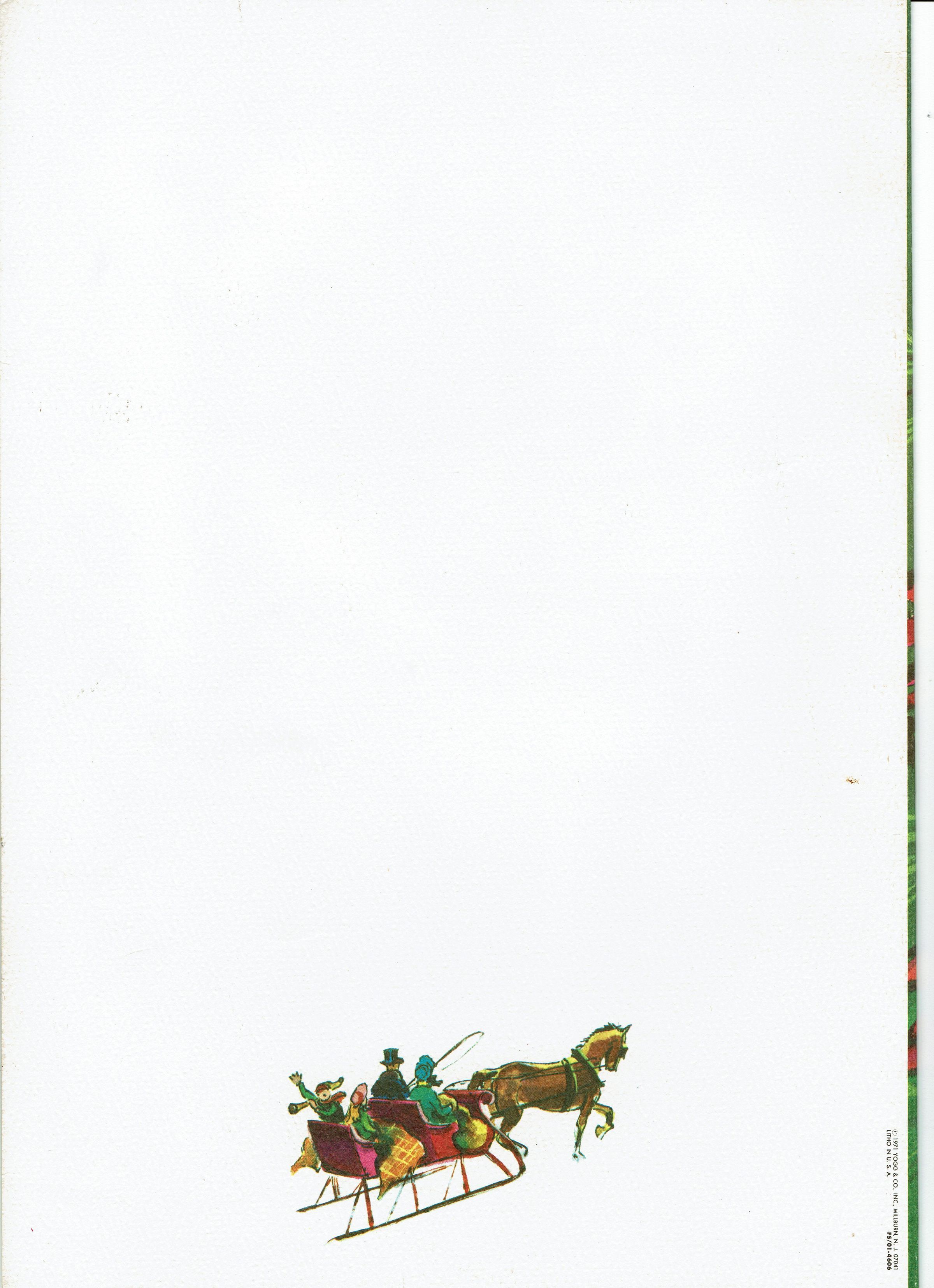 Color Lithographic Christmas Dinner Menu printed by Yogg & Co., 1971. 4 pp. Full color front and back covers, two color interior menu. No identification of the restaurant.