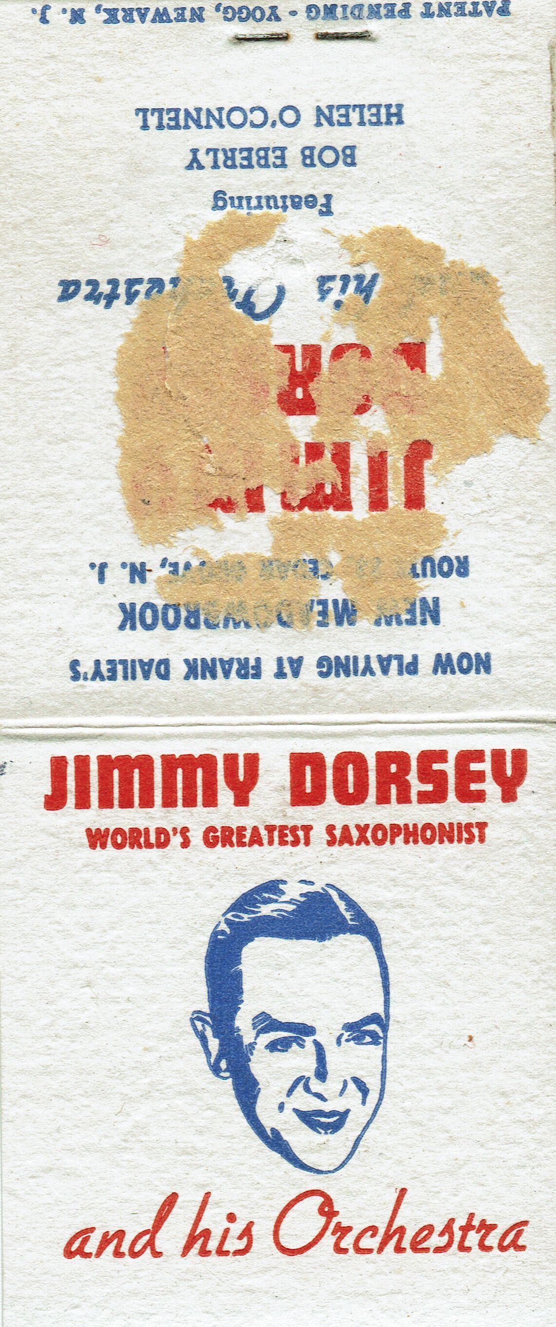 Matchbook Cover produced by Yogg & Co. advertising Jimmy Dorsey, World's Greatest Saxophonist, Now Playing at Frank Dailey's New Meadowbrook, Cedar Grove, N.J.