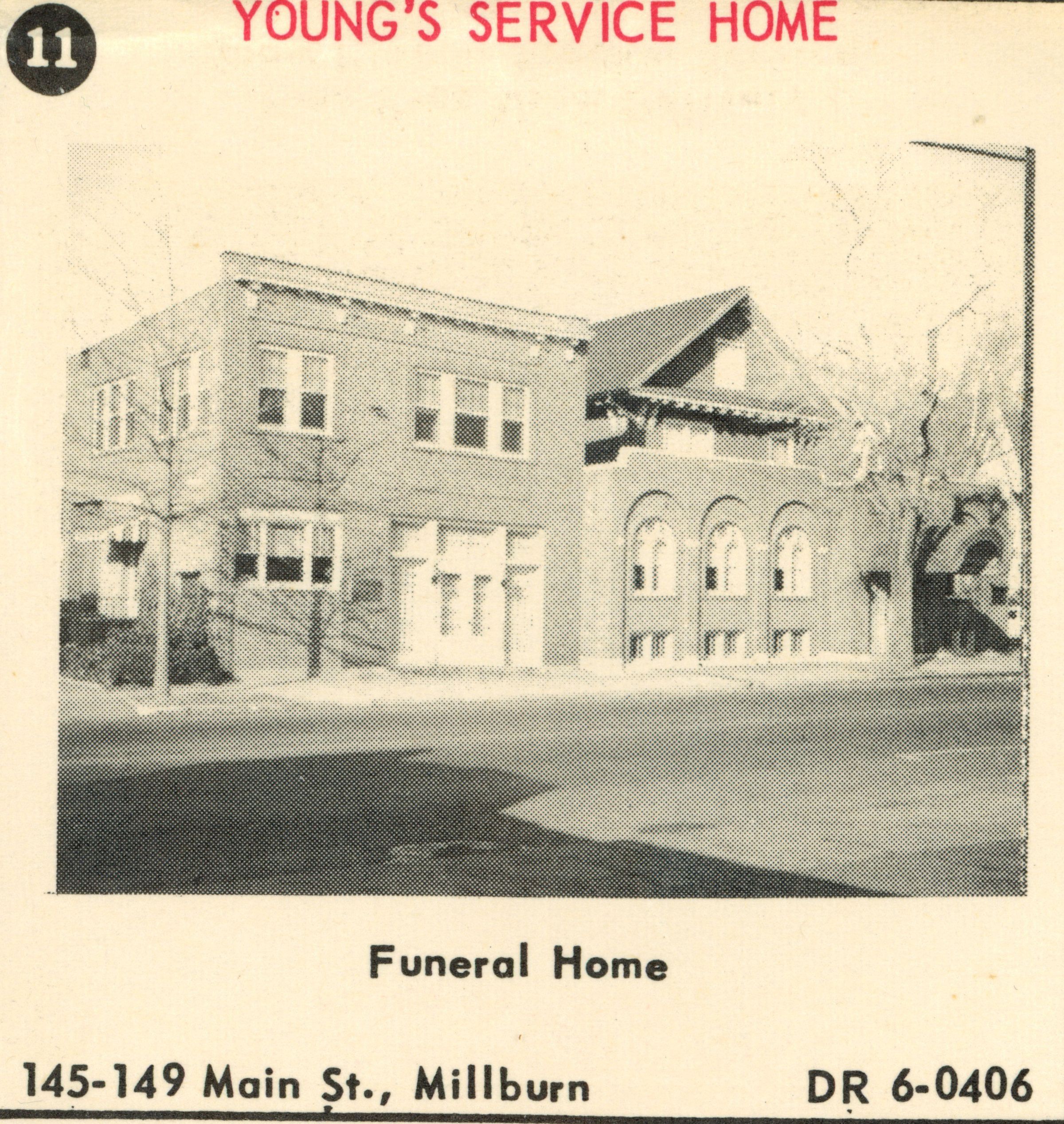 Photograph of Young's Service Home Funeral Parlor at 145-149 Main Street, Millburn published in the 1955 Shopper's Guide to Millburn, New Jersey, published by Photolith Advertising Company, Cranford, N.J.Acquisition